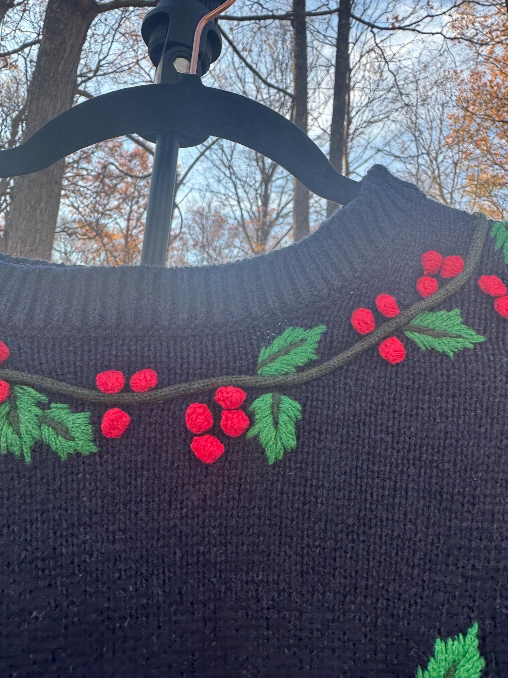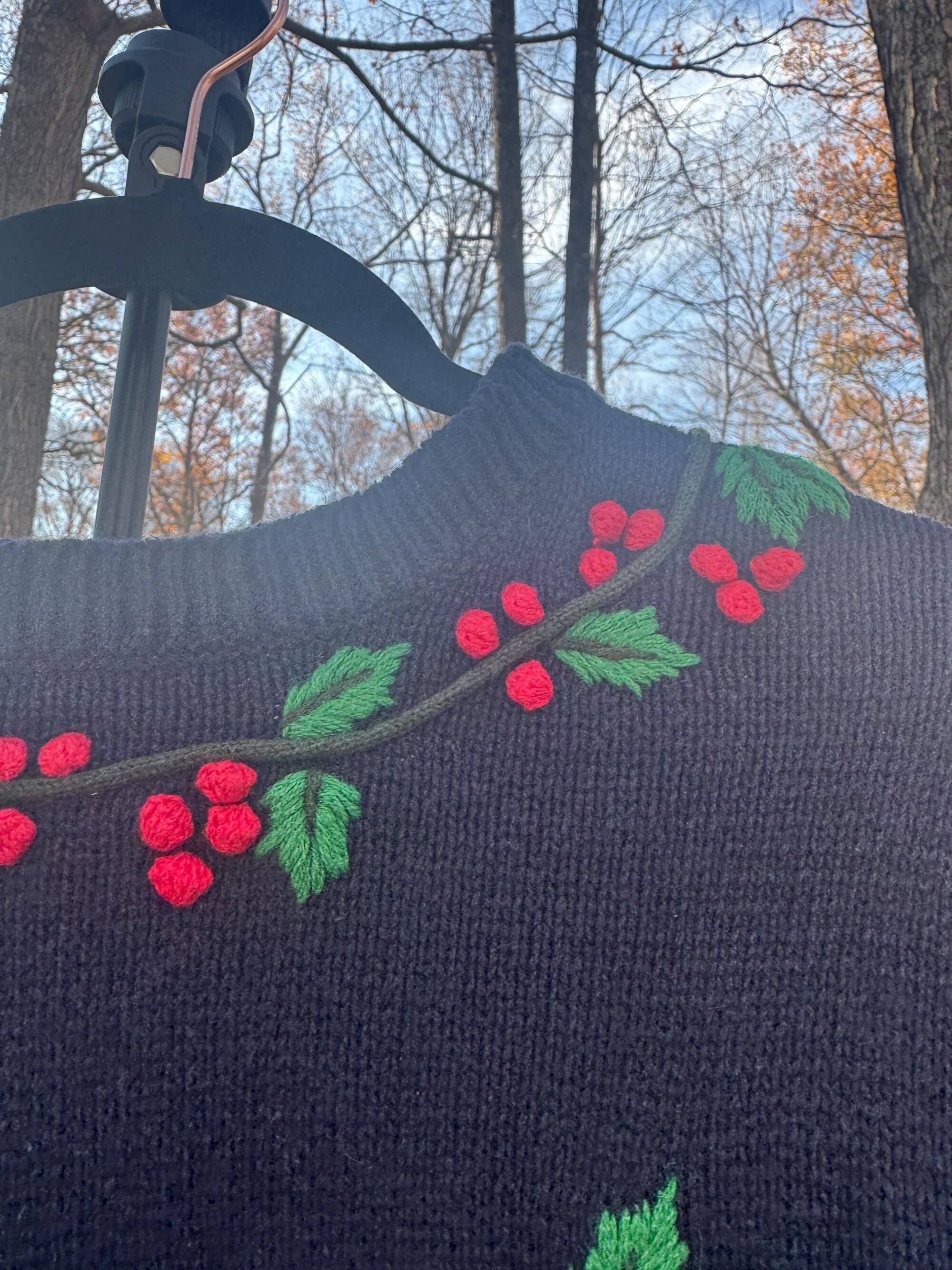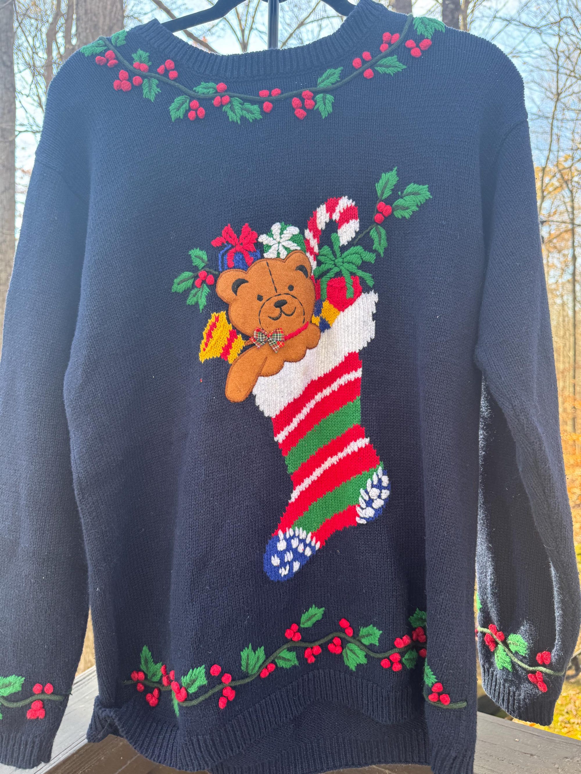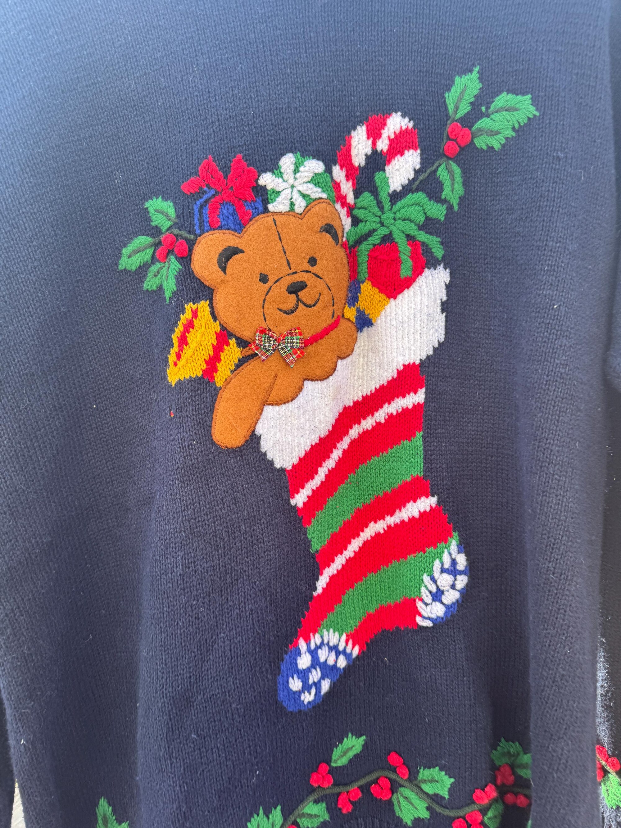 Bryn Connelly Ugly Christmas Sweater Teddy Bear in Stocking Berries Embroidery Size L Vintage