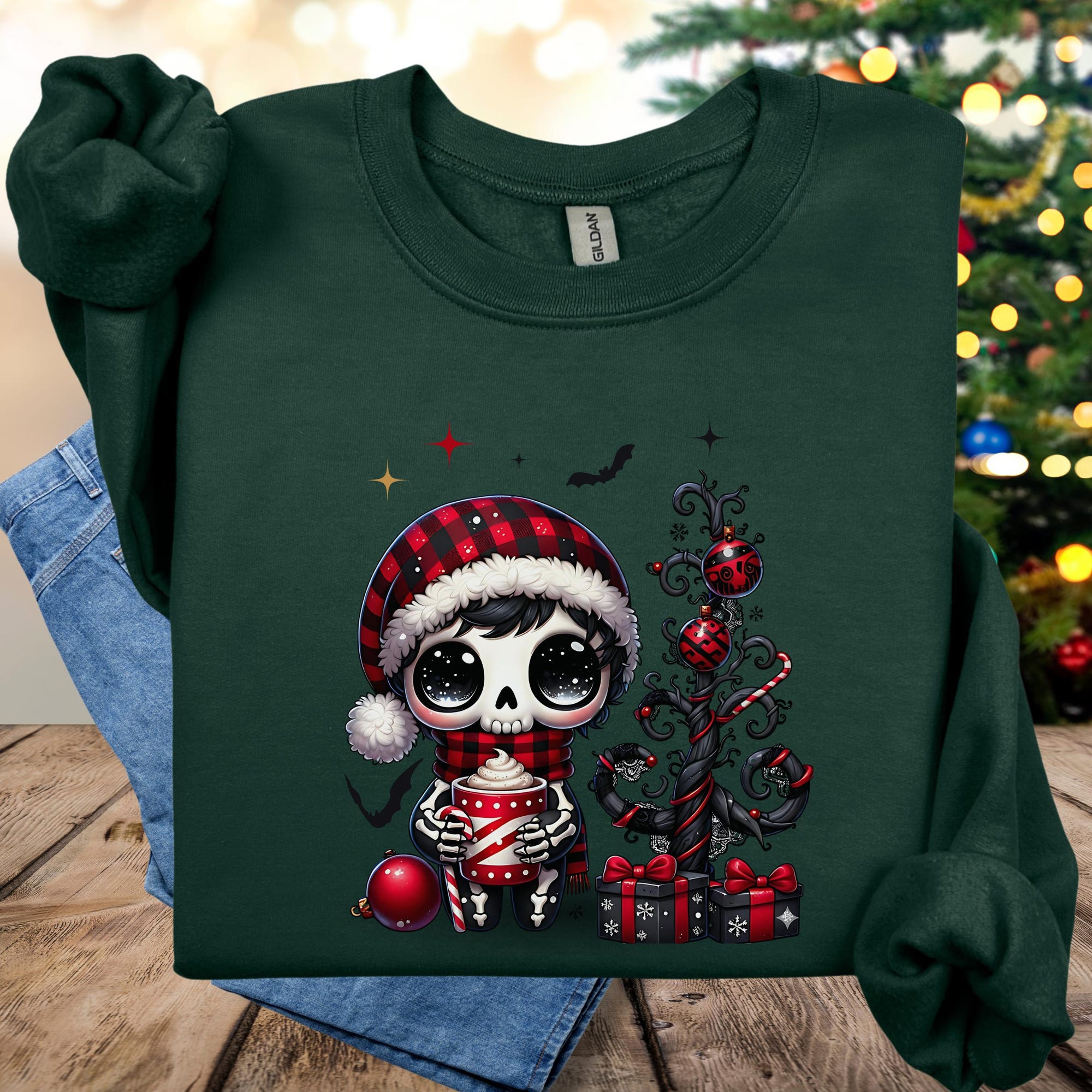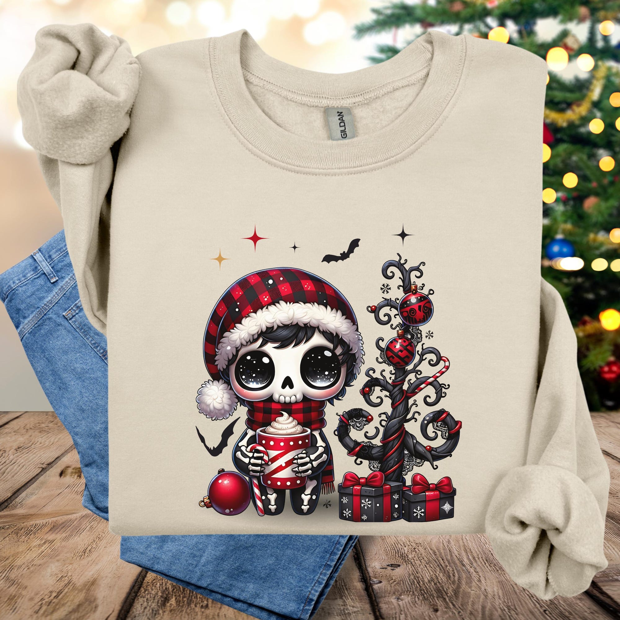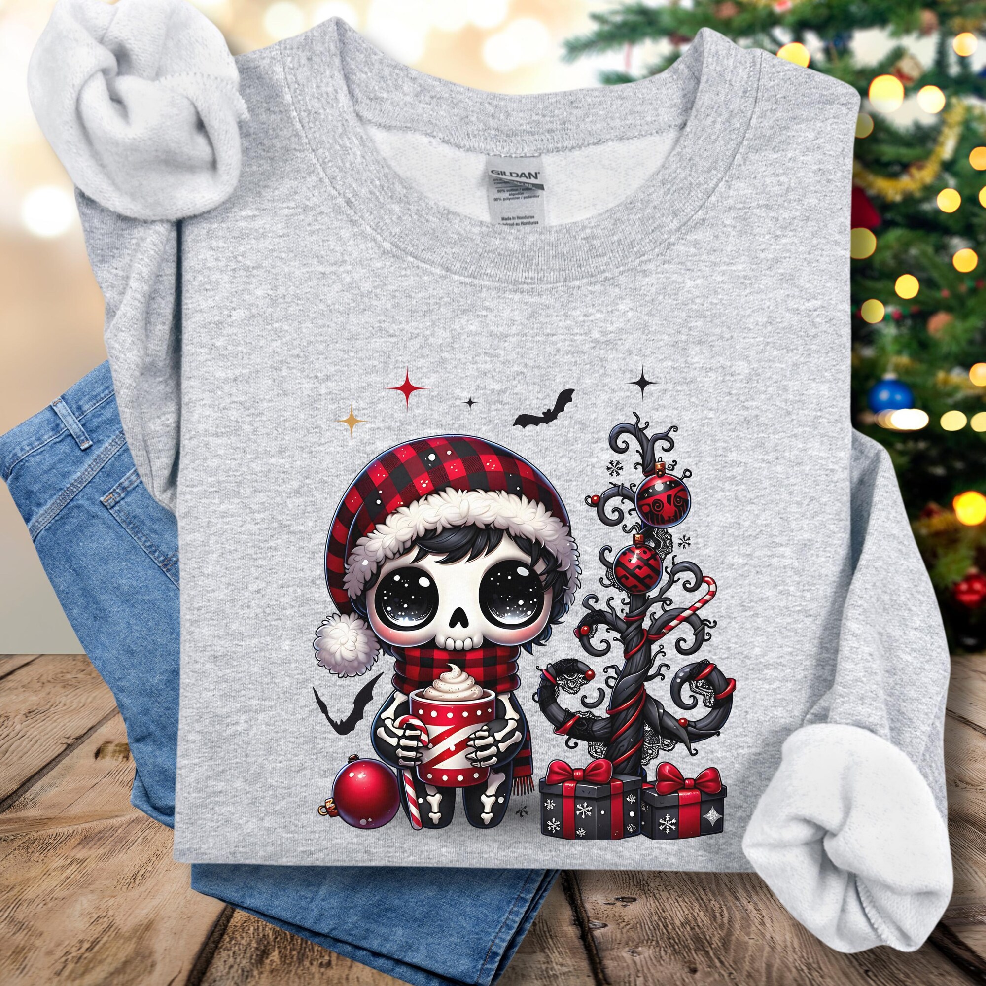 Chibi Goth Christmas Sweatshirt, Cute Holiday Crewneck Jumper, Festive Emo Xmas Pullover, Pink Christmas Winter Apparel, Dark Kawaii Santa