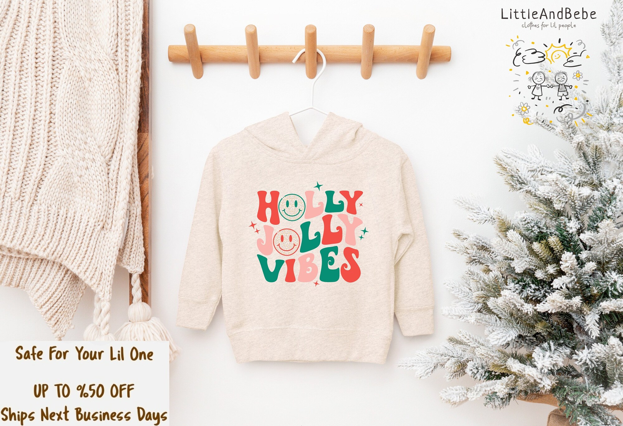 Christmas Sweatshirt For Kids, Holly Jolly Vibes Natural Boho Christmas Hoodie For Girls, Christmas Sweatshirt For Boys, Holly Jolly Hoodie