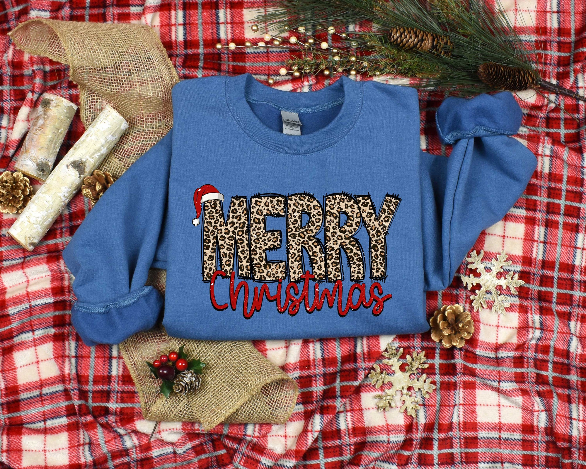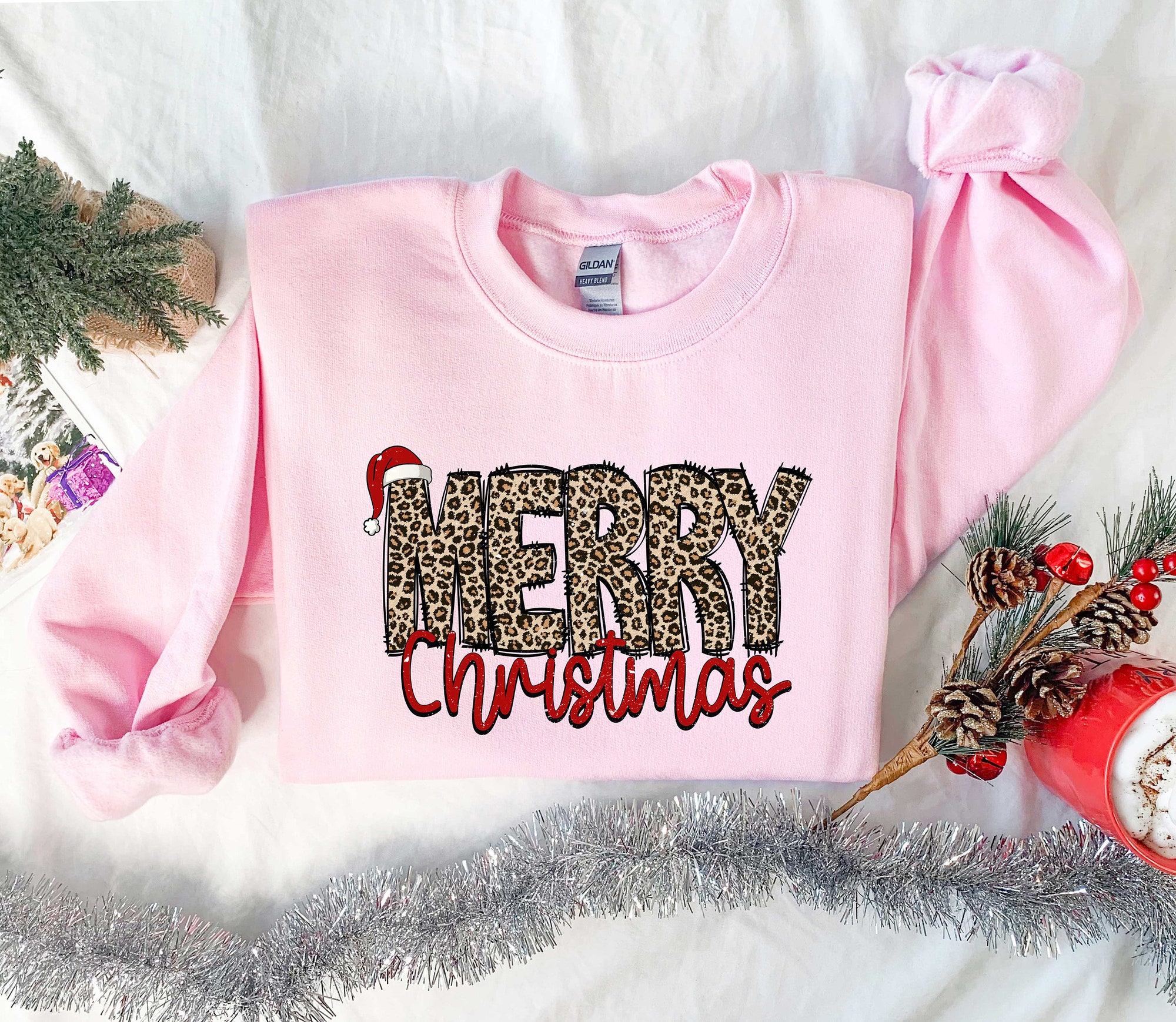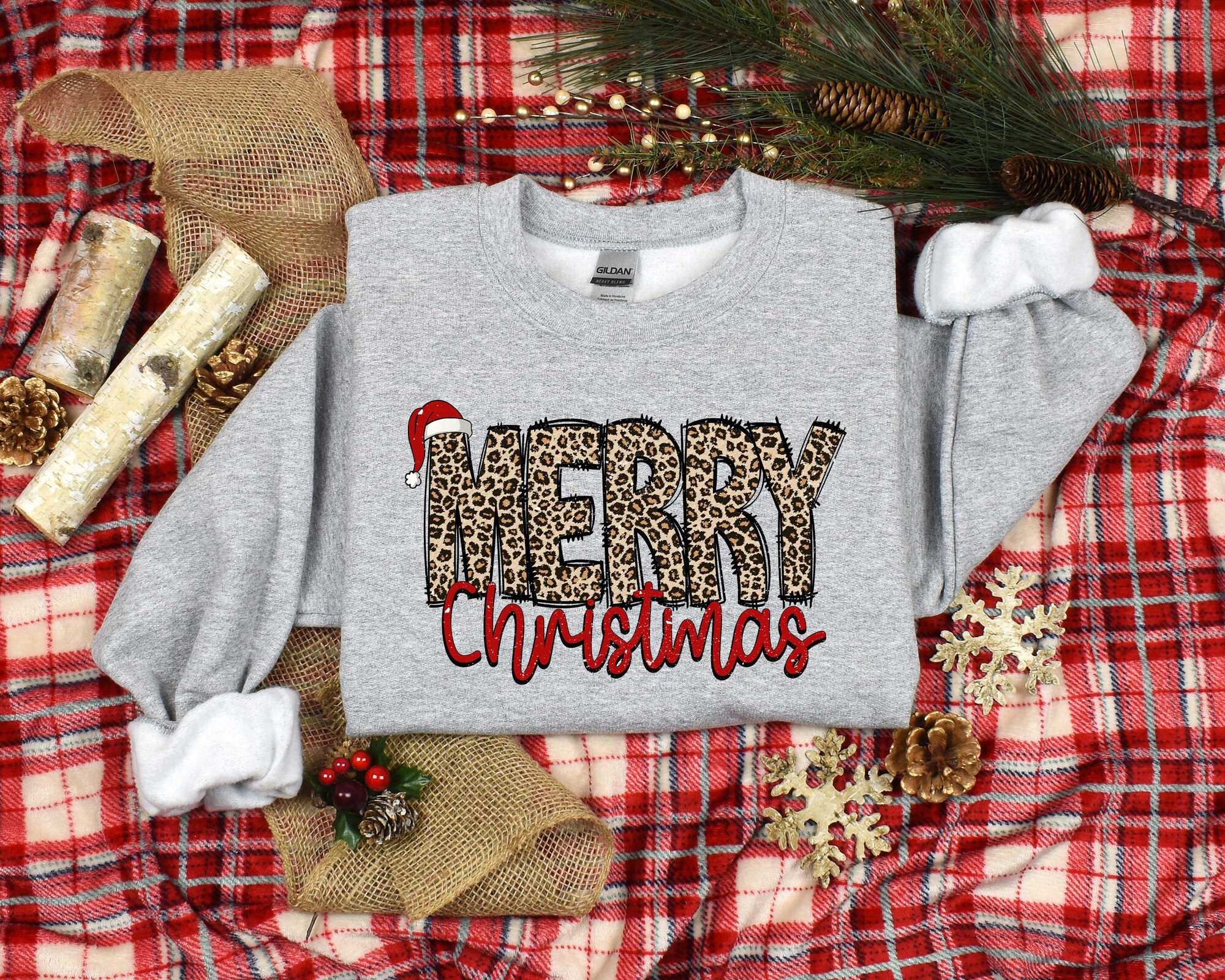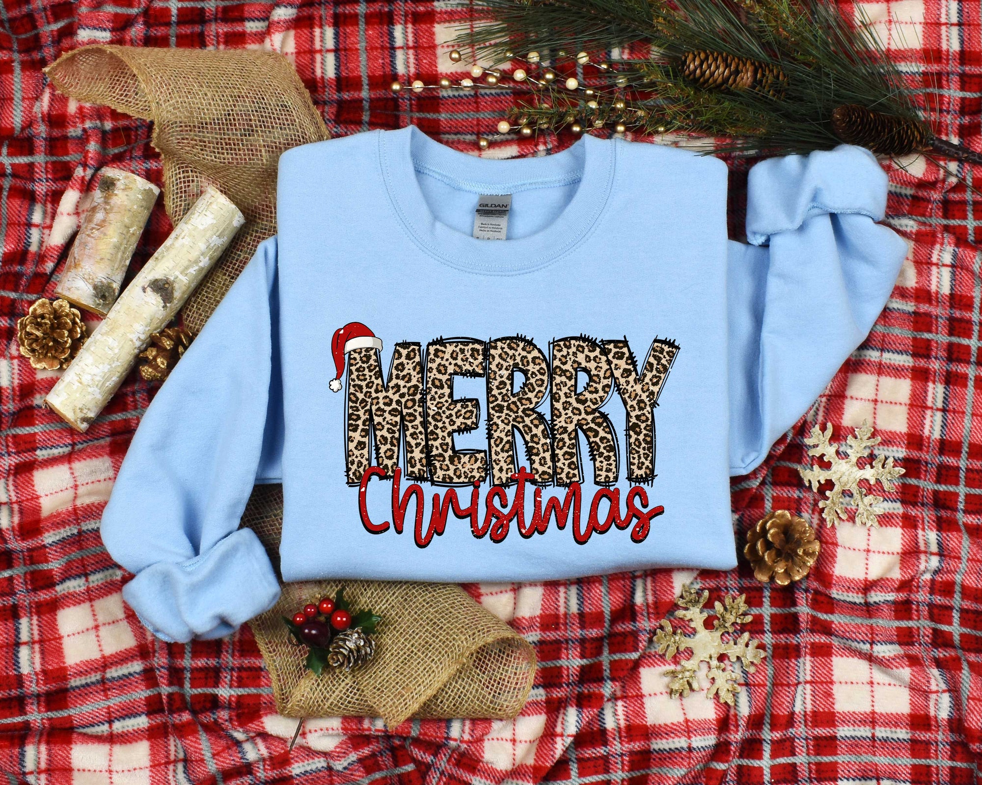 Christmas Sweatshirt, Merry Christmas Sweatshirt, Christmas Leopard Patterned Shirt, Christmas Believe Shirt, Merry Bright Shirt
