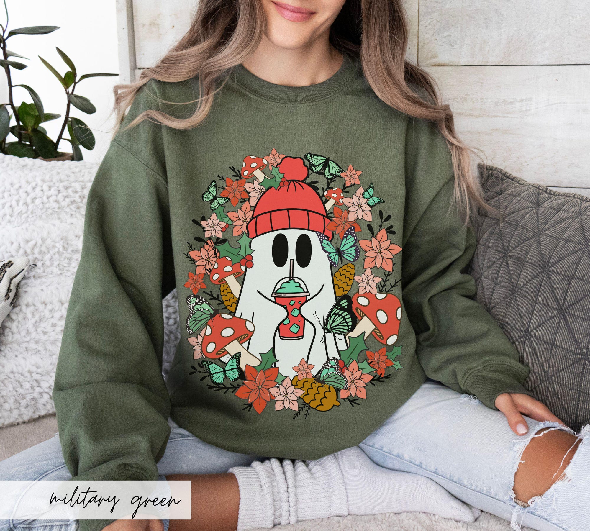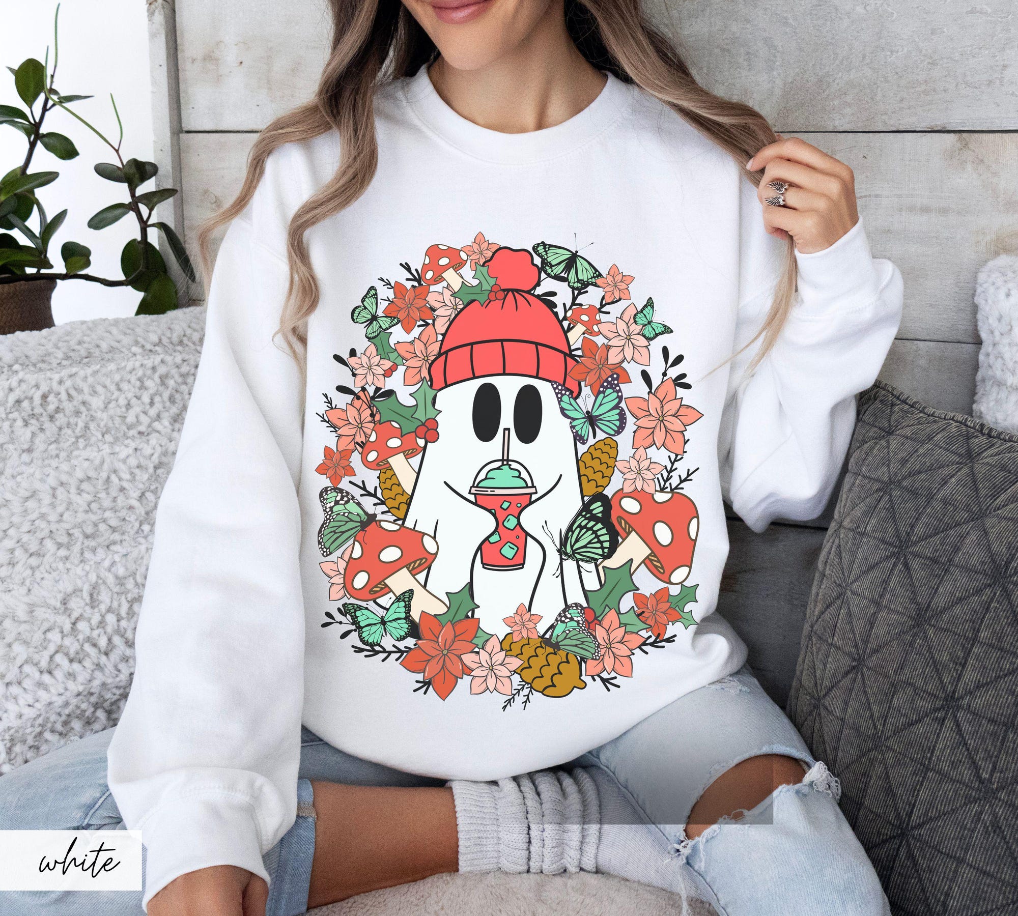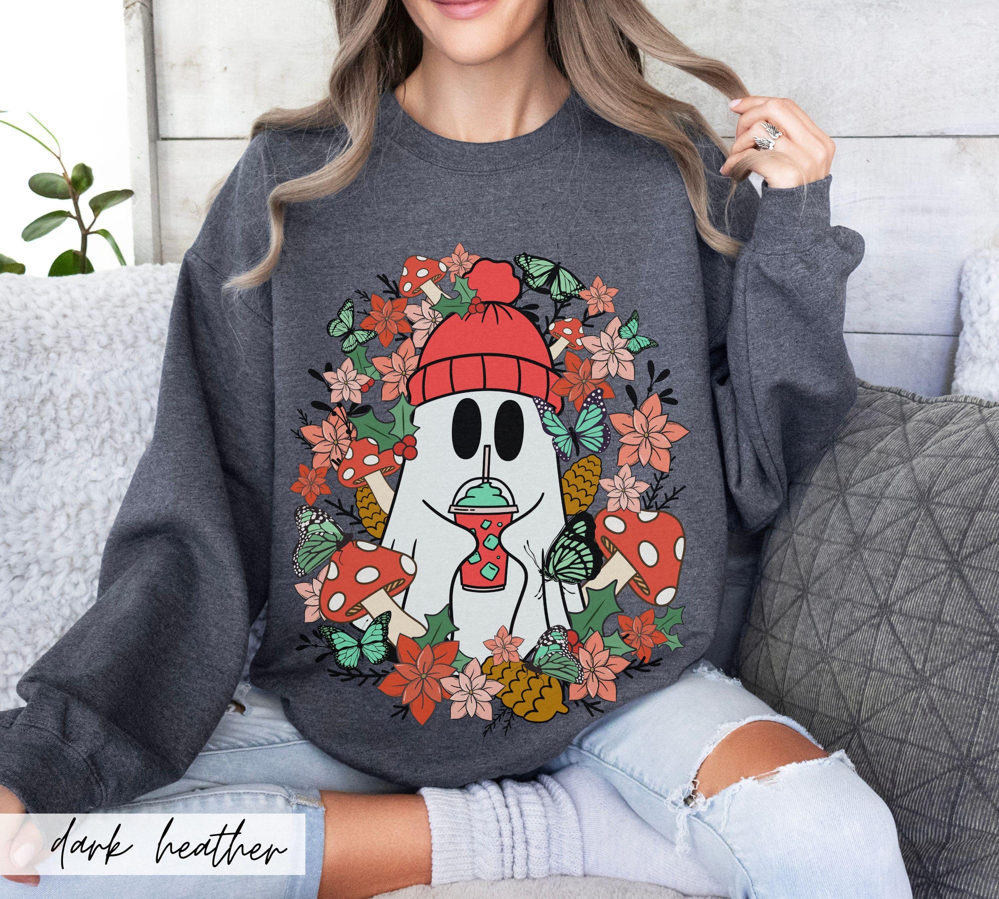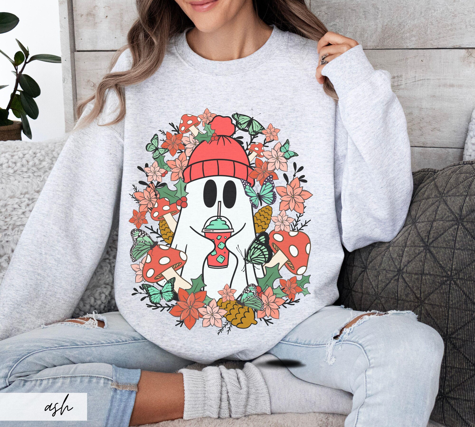 Cottagecore Coffee Ghost Christmas Sweater, Winter Fairycore Ghost Cozy Coffee Crewneck, Cartoon Butterfly Poinsettia Winter Whimsigoth Top