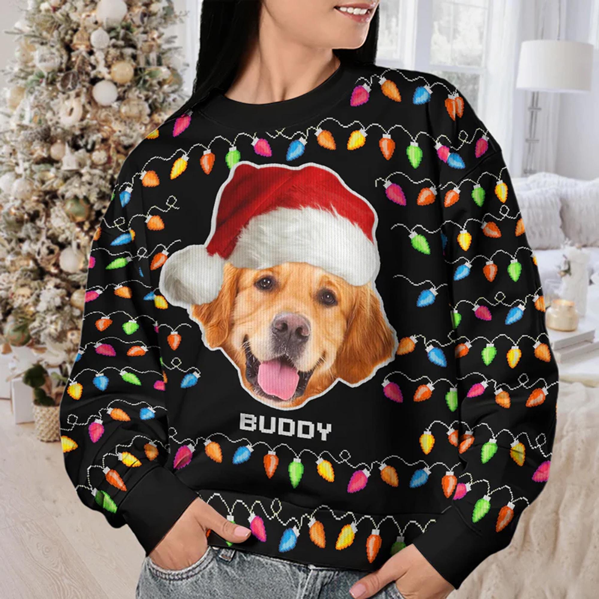 Custom Name Dog and Cat Face Santa Hat Ugly Sweater, Pet Photo Ugly Xmas Ugly Sweater, Custom Dog & Cat Face Christmas Ugly Matching Gift