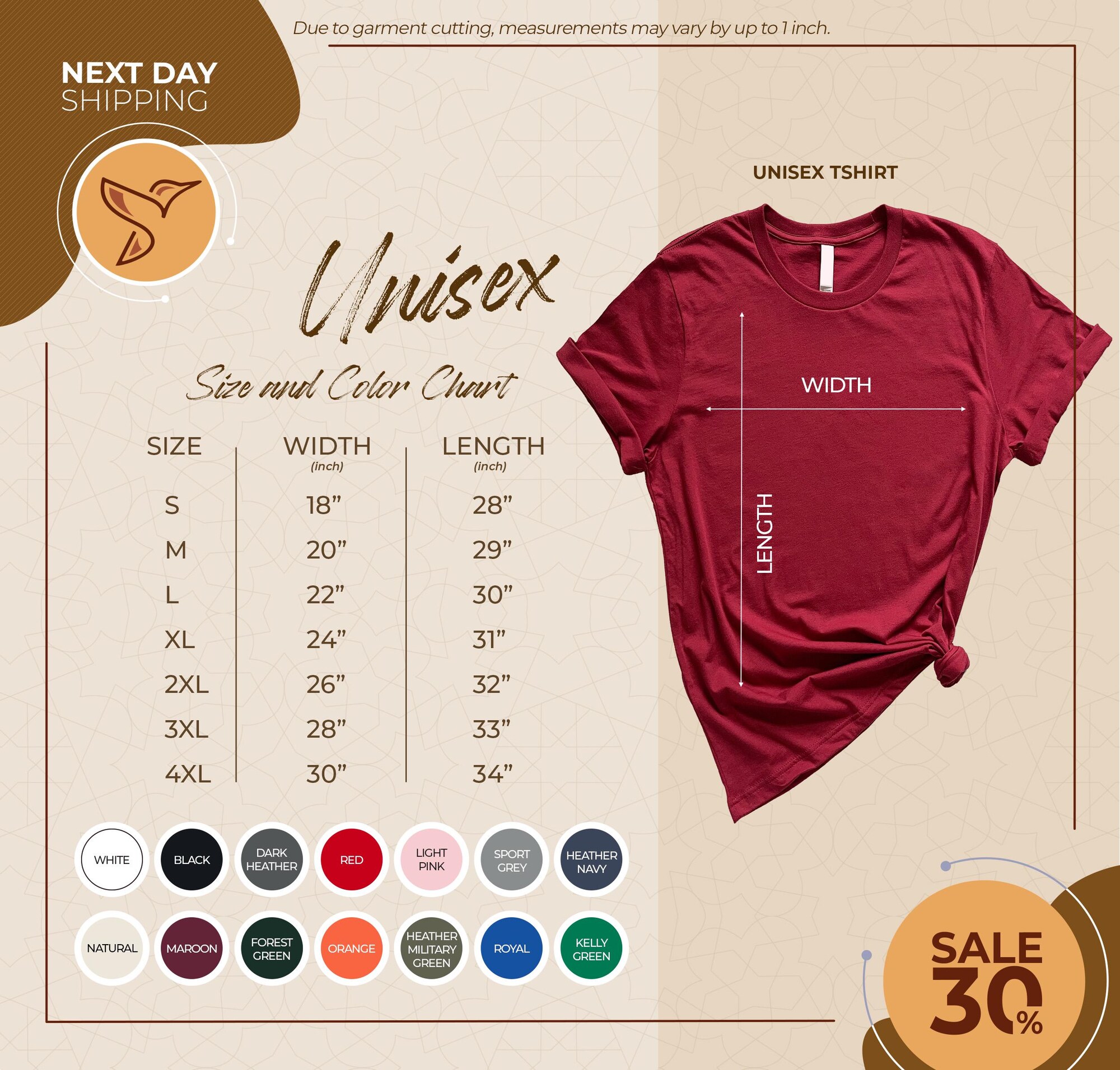 This is a Gildan t-shirt. It features a unisex cut, making it suitable for everyone. It weighs approximately 4 oz and, in white and black, is made from 100% cotton, and other colors are made from a blend of 50% to 85% cotton with the remainder being polyester. The fabric is soft to the touch, ensuring comfort throughout the day. The size measurements are consistent and true to size, providing a reliable fit. The design is created using a heat vinyl printing technique, ensuring durability and vibrant colors.