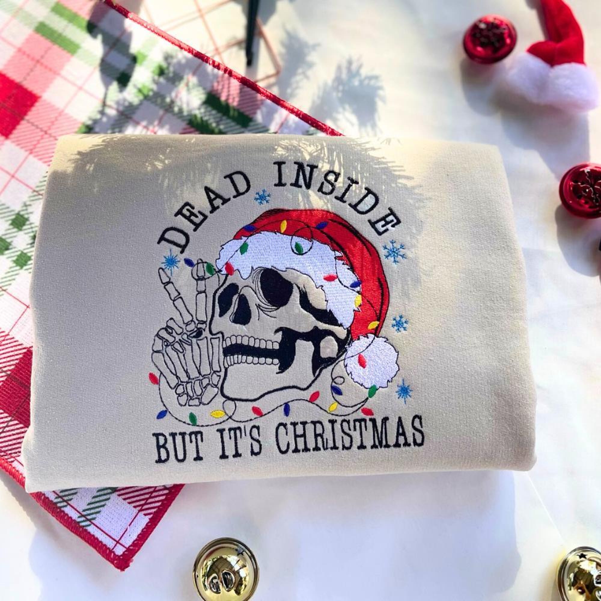 Dead Inside But It’s Christmas Skeleton Embroidered Sweatshirt, Funny Winter Crewneck Jumper, Holiday Embroidery Hoodie, Gift For Xmas