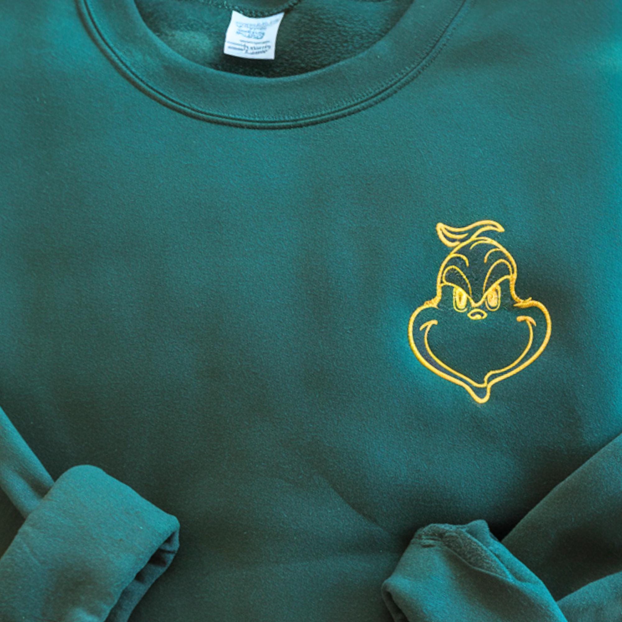 Embroidered Grinch Face Crewneck for the Holidays | Grinch Holiday Sweater