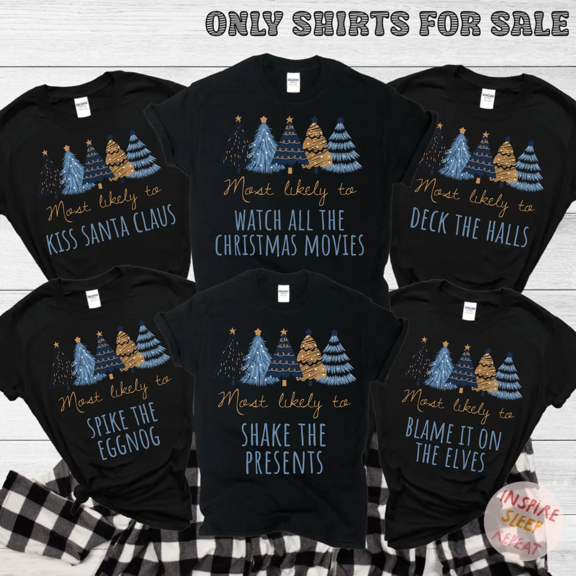 Family Group Christmas Shirt, Matching Christmas outfits Shirts, Most Likley To Funny Christmas T-Shirts, Blue and Gold Christmas Trees Tops