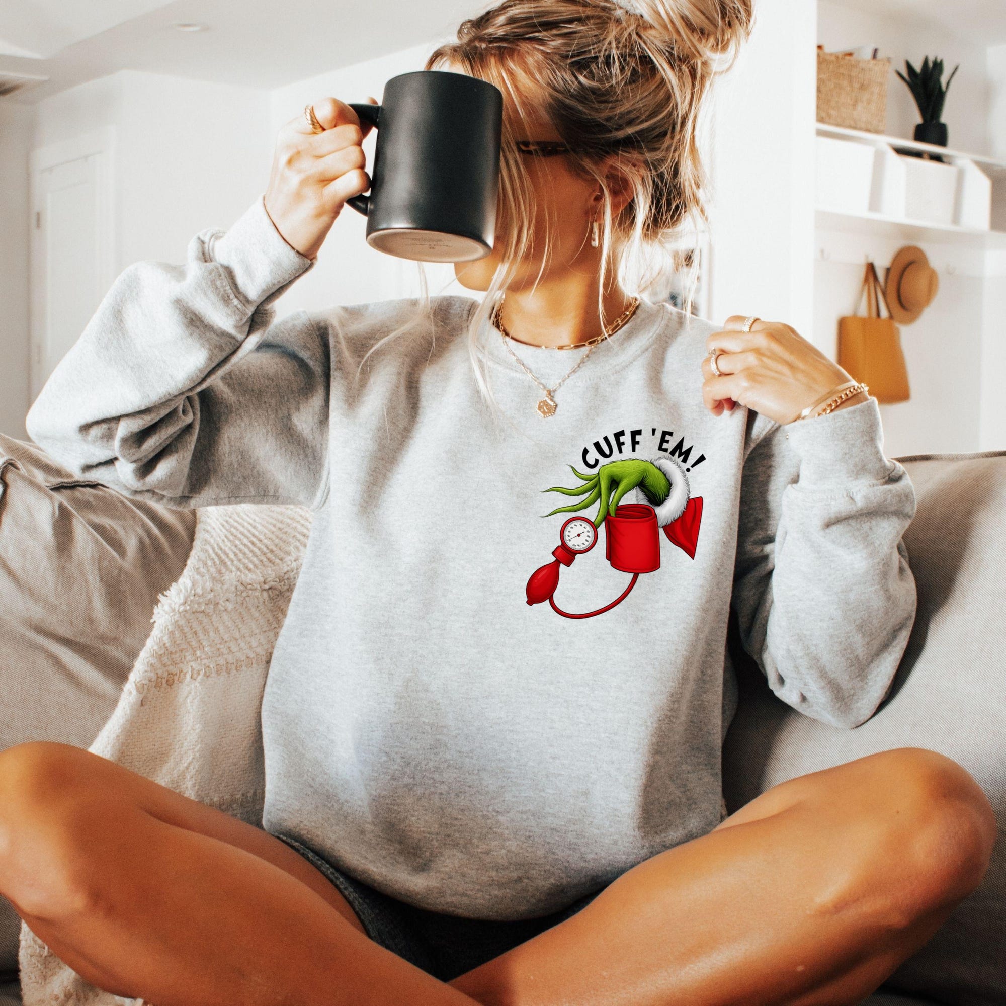 Funny Cuff Em Nurse RN LPN Christmas Sweatshirt, Grinchy Hand Stethoscope Sweatshirt, Funny Medical Christmas Gift Healthcare Worker