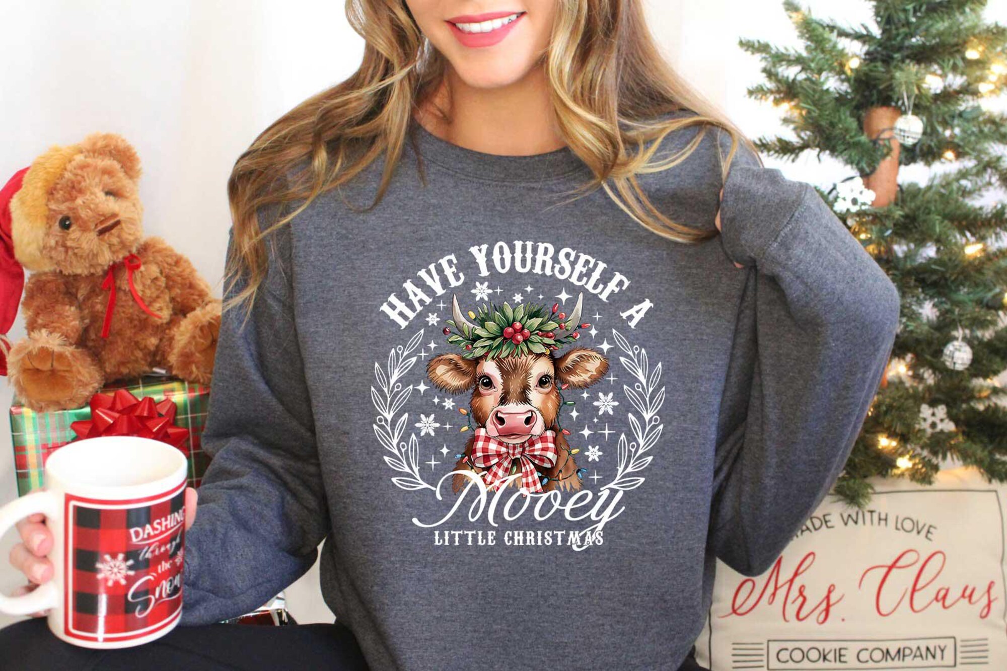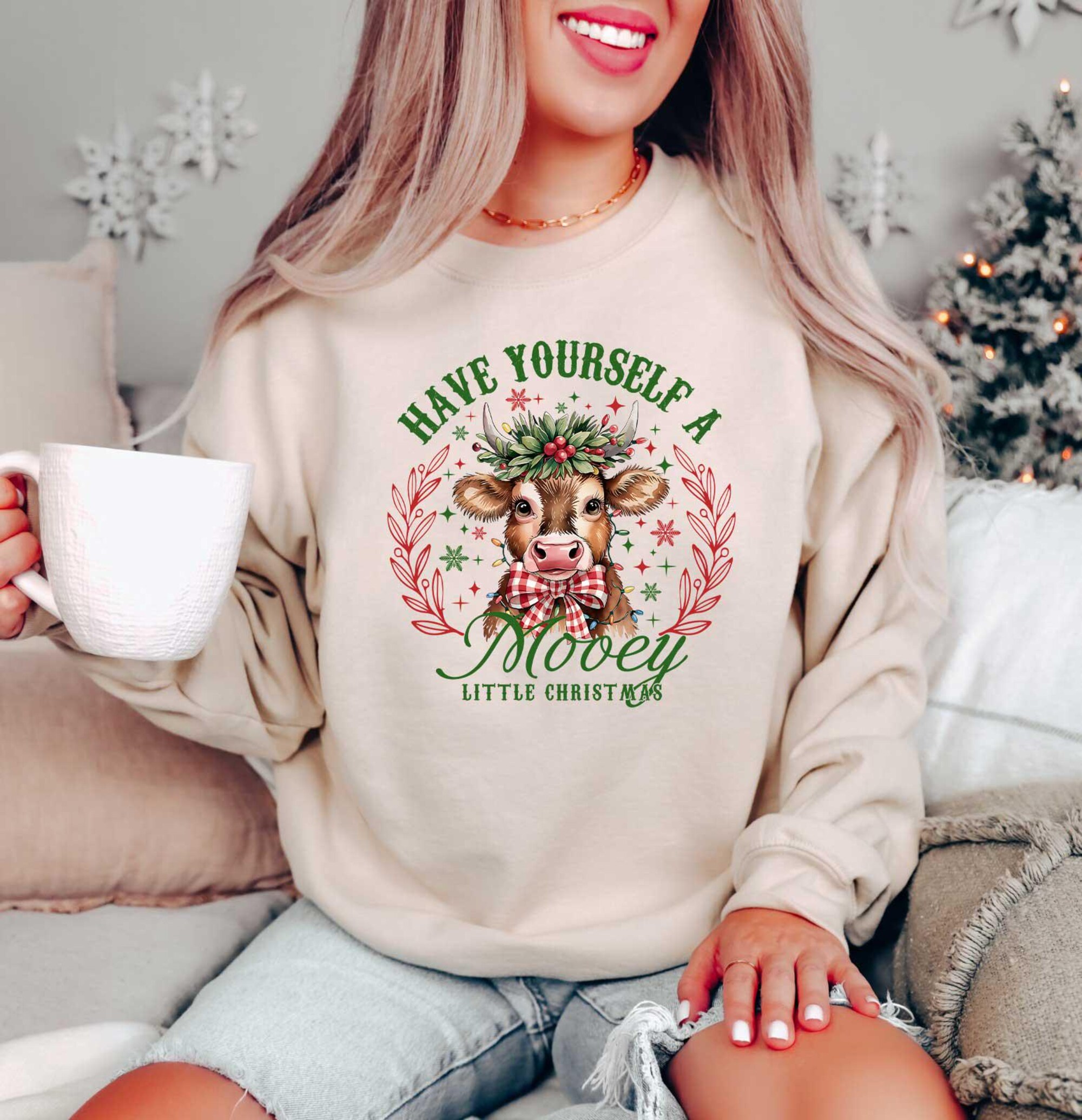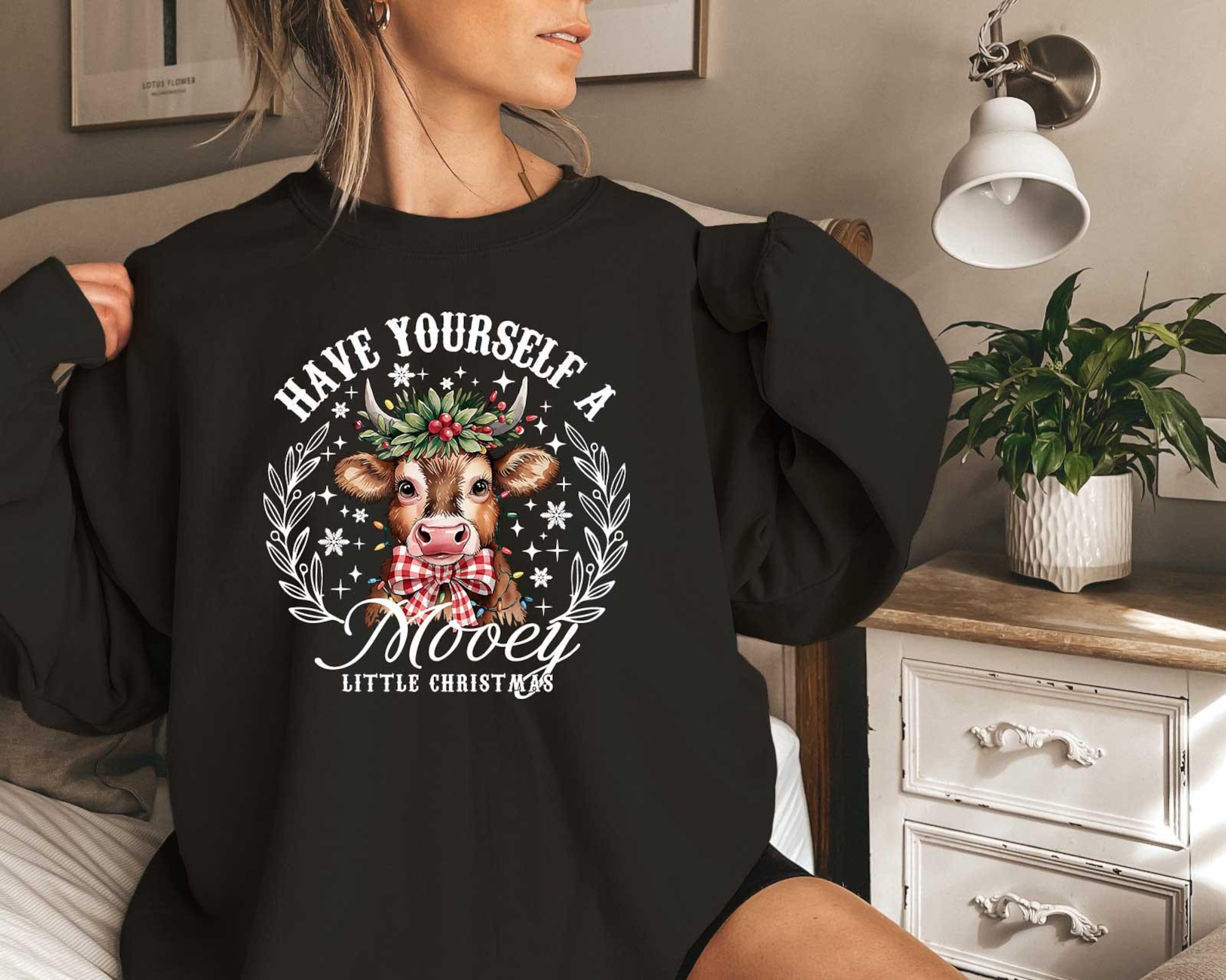 Have Yourself A Mooey Little Christmas Sweatshirt – Coquette Country Christmas Shirt – Cow Lover Christmas Gift, Christmas Cow Shirt