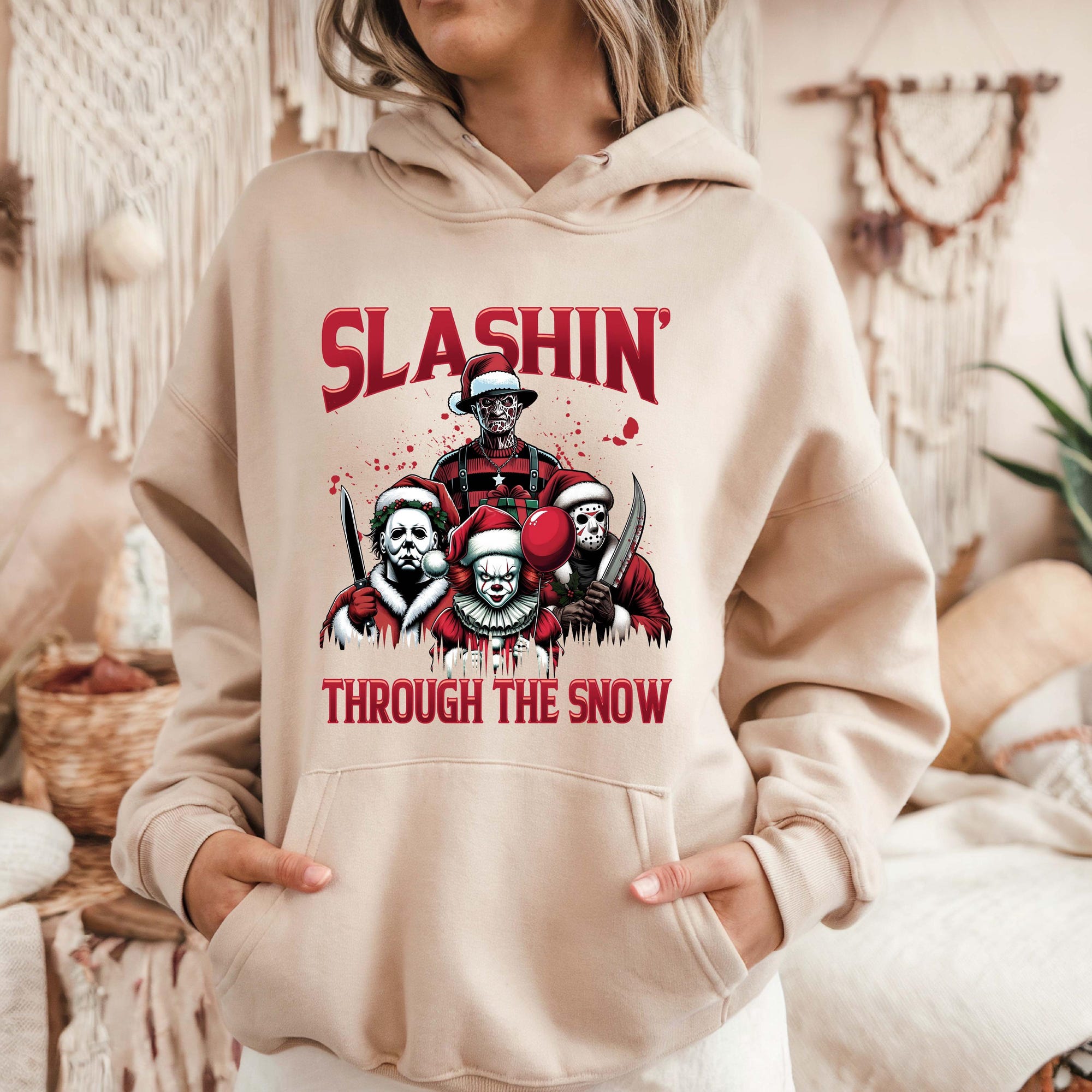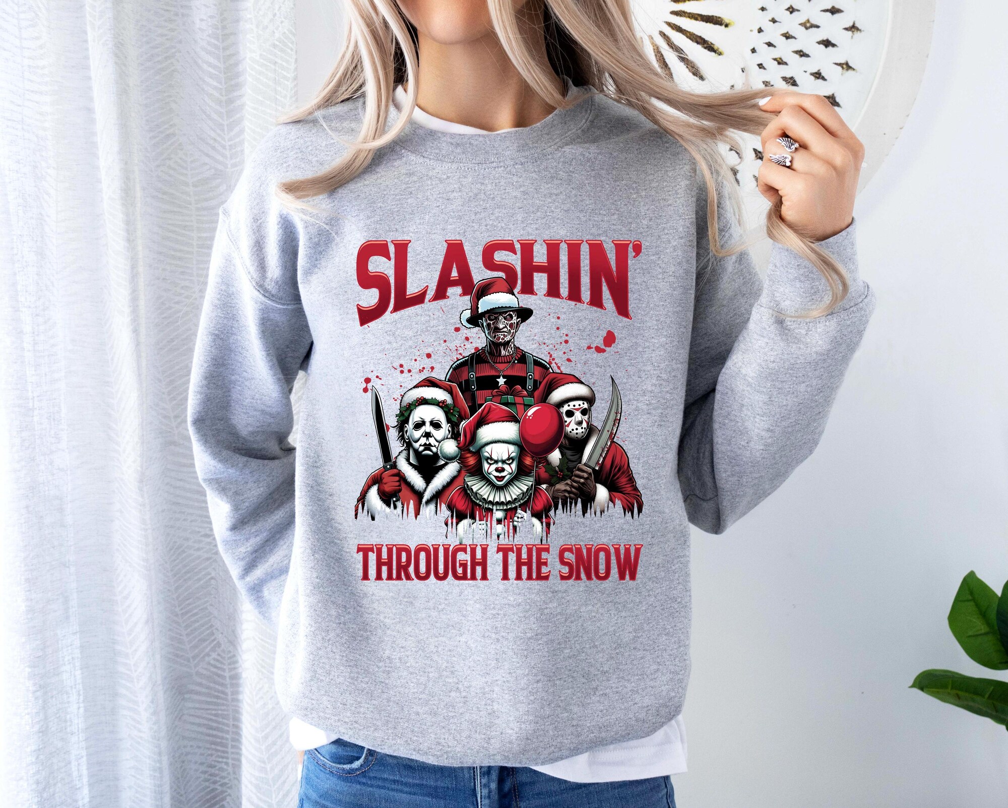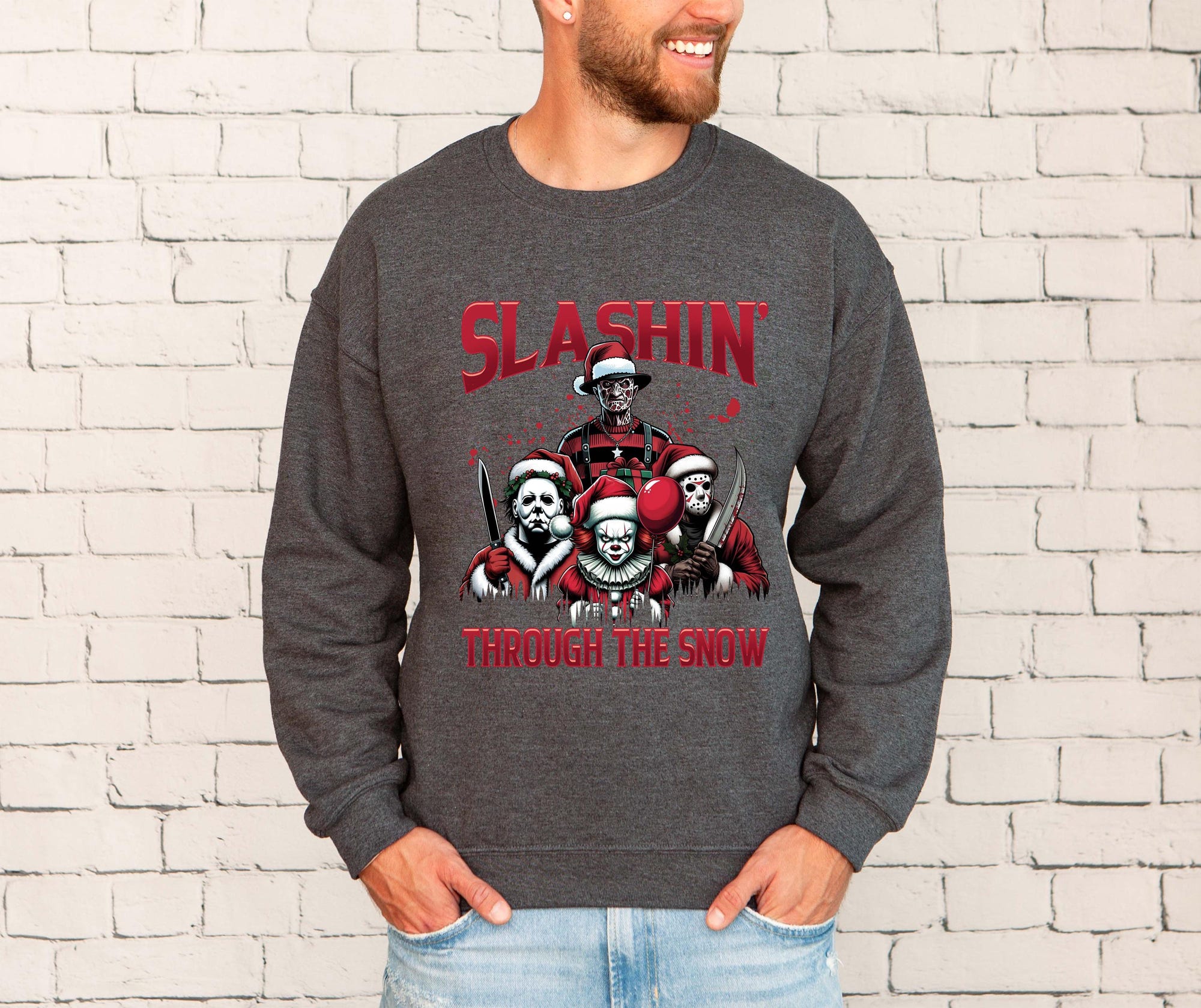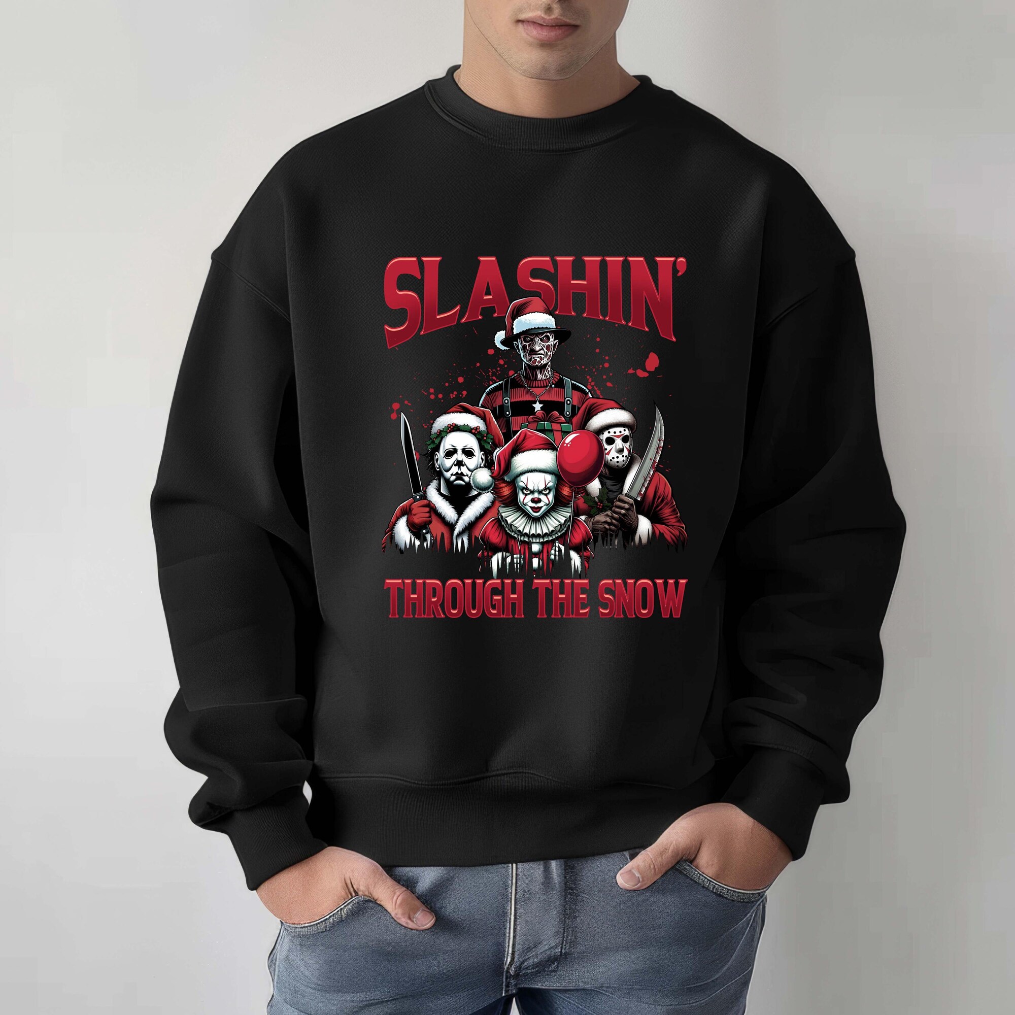 Horror Characters Christmas Sweatshirt, Ugly Christmas, Slashin’ Through The Snow Christmas Crewneck, Horror Movie Character Holiday Gift