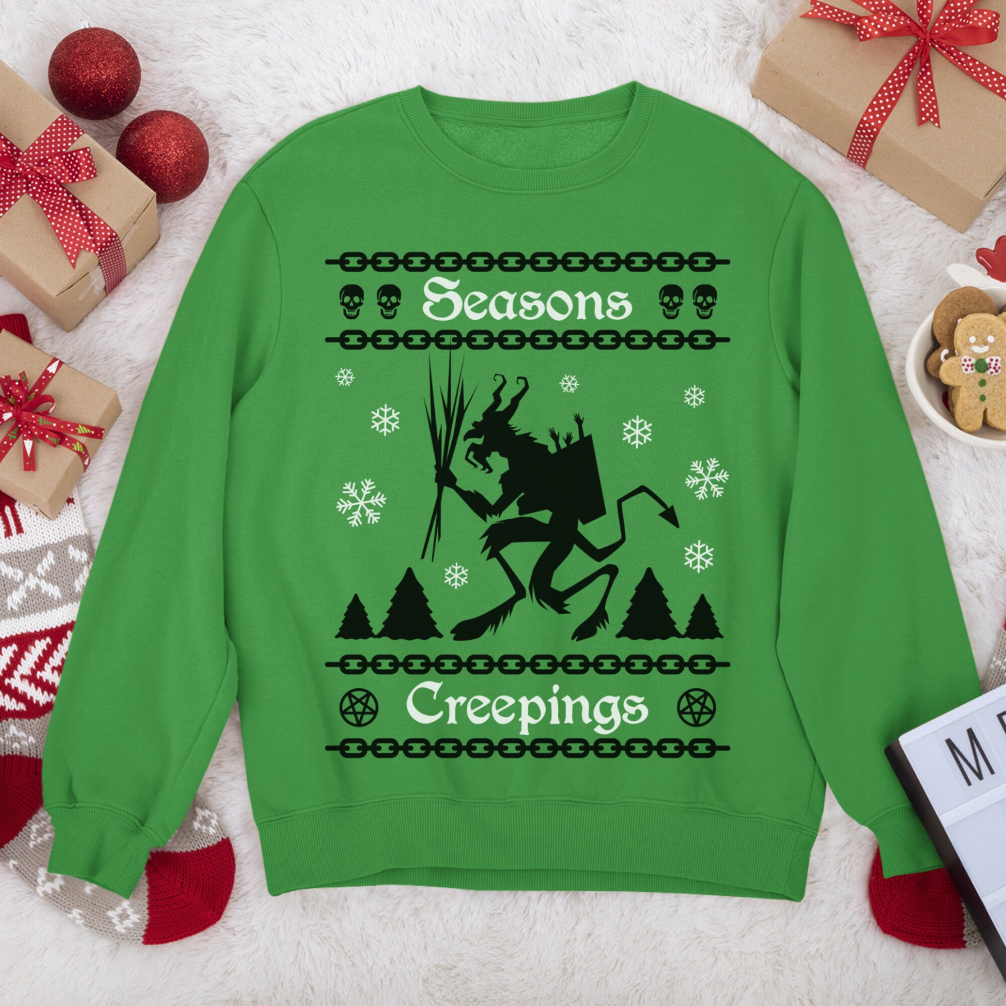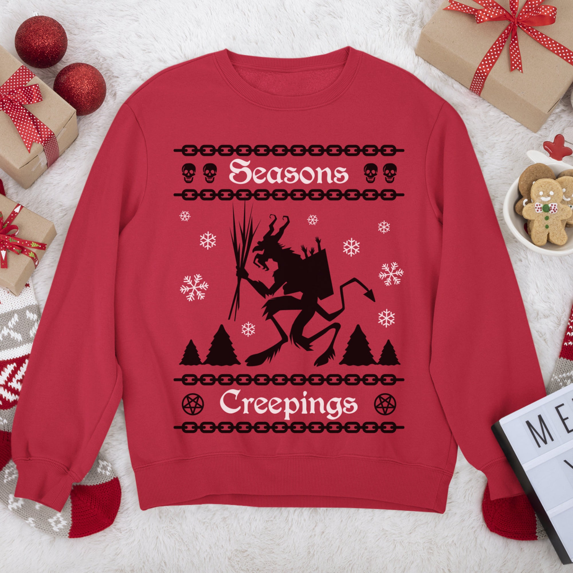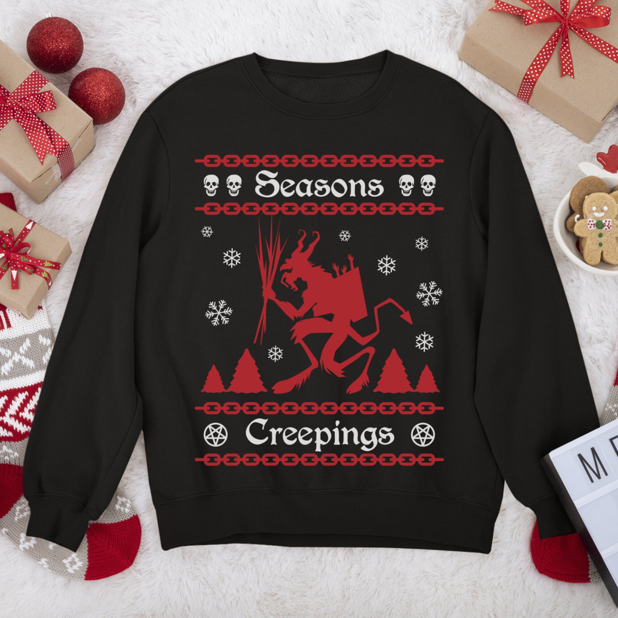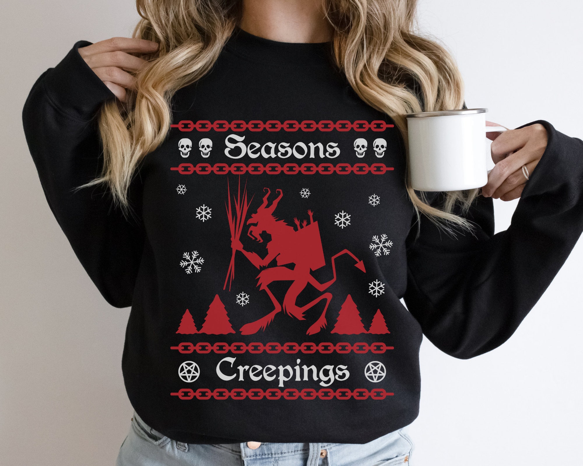 Snuggle up in this super soft and cozy sweatshirt with a funny Krampus Christmas design of Seasons Creepings.