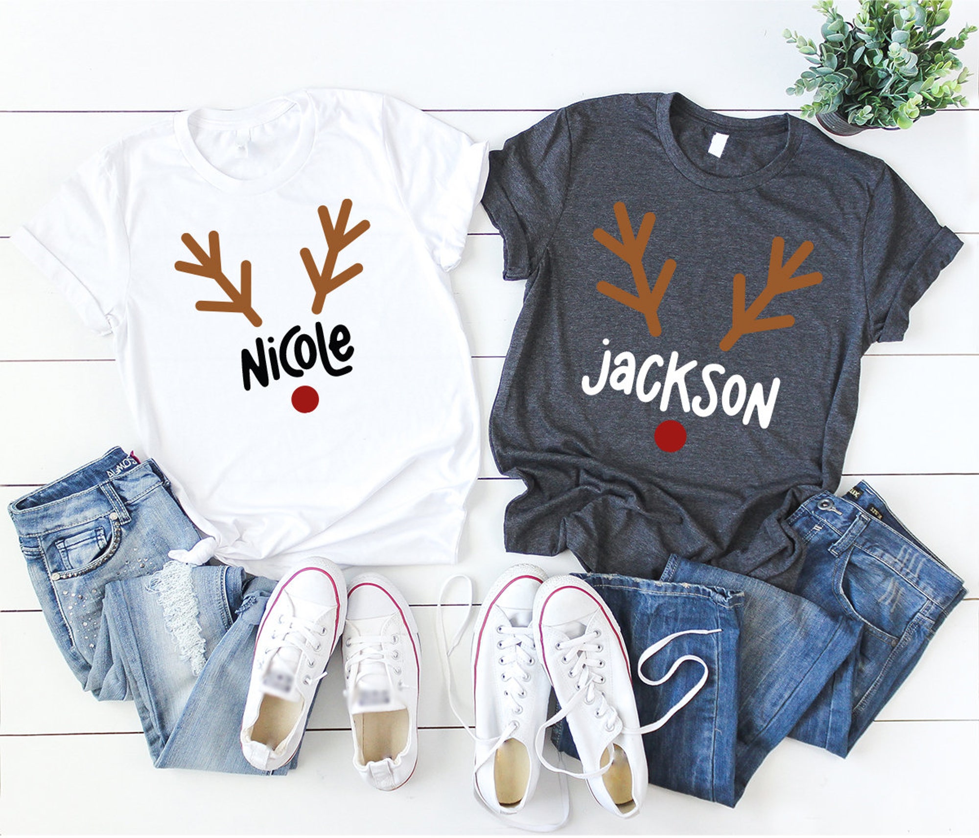 Matching Christmas Family Shirts, Cute Custom Name Reindeer Graphic Tees for Family, Funny Customizable Family Christmas Crewneck Shirts