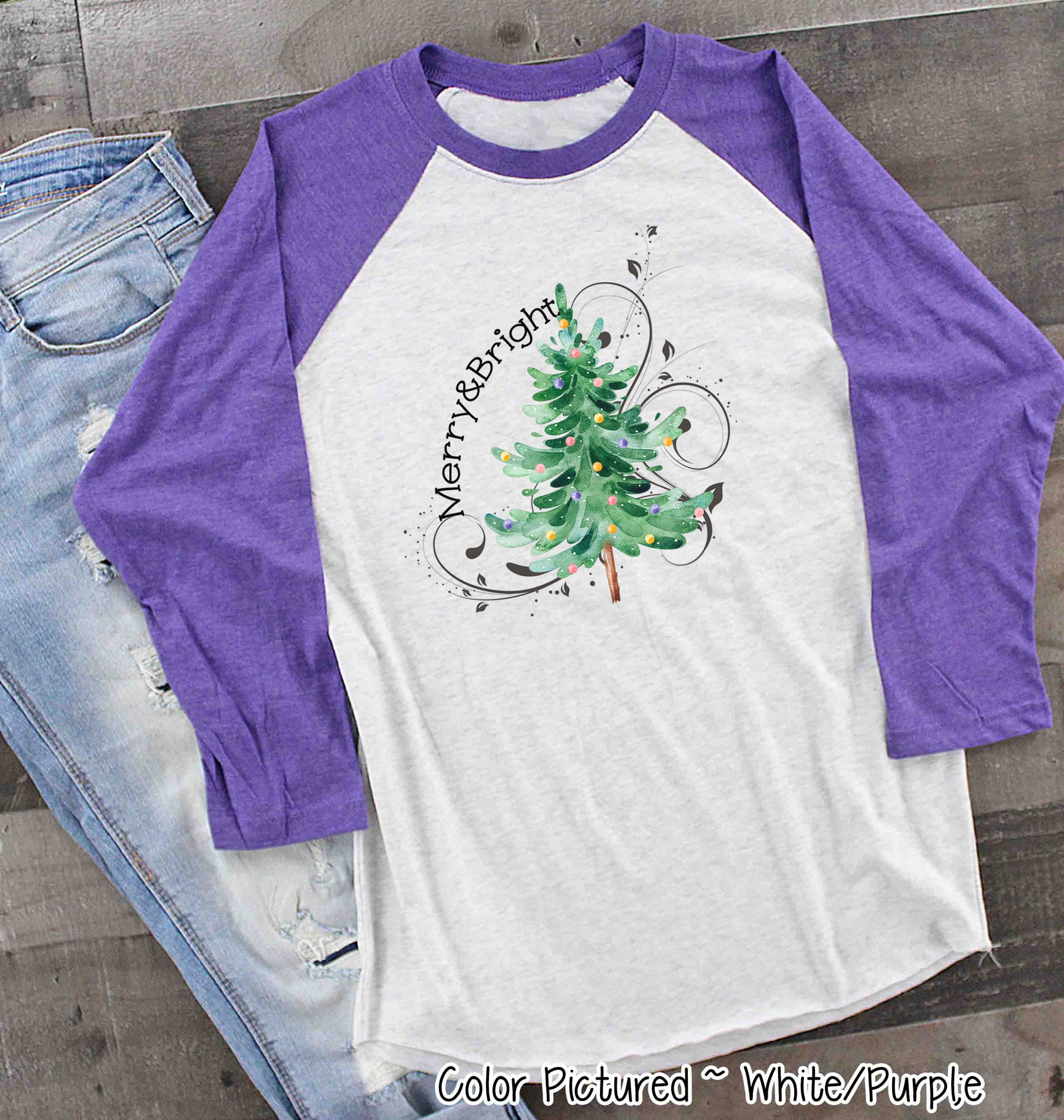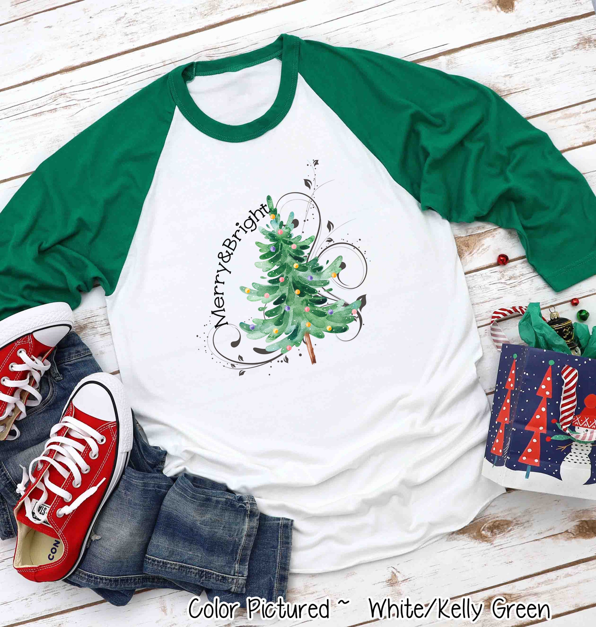 Merry and Bright Christmas Tree Shirt, Womens Christmas Shirt, Holiday Shirt for Her, Merry Christmas Family Matching Shirt, Raglan Tee