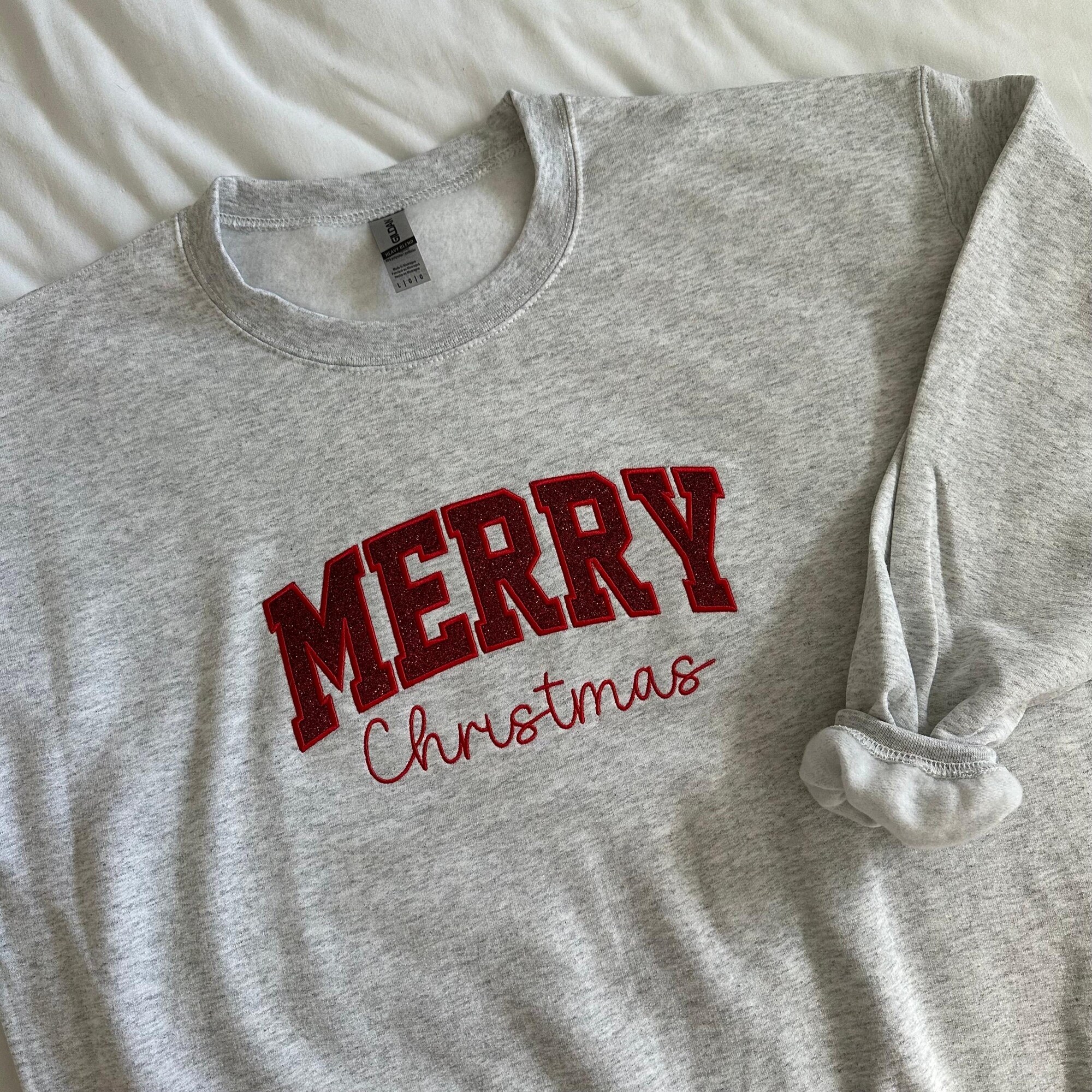 Merry Christmas Appliqué Embroidered Sweatshirt Glitter Gift Holiday Red Grey Holiday Crewneck Embroidery