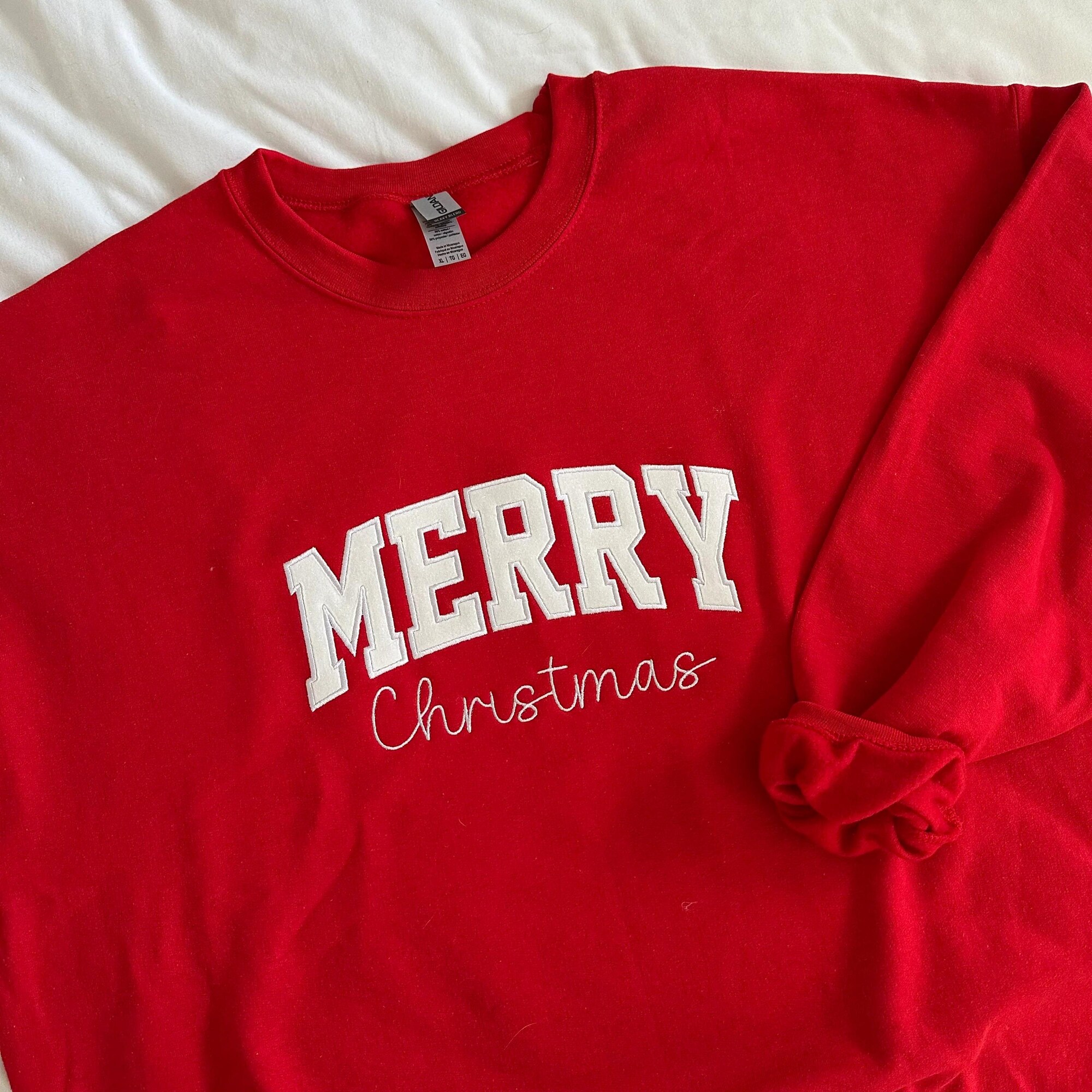 Merry Christmas Appliqué Embroidered Sweatshirt Glitter Gift Holiday Red Grey Holiday Crewneck Embroidery