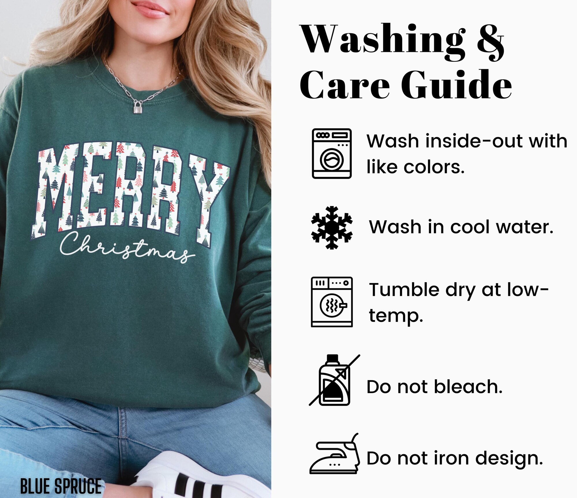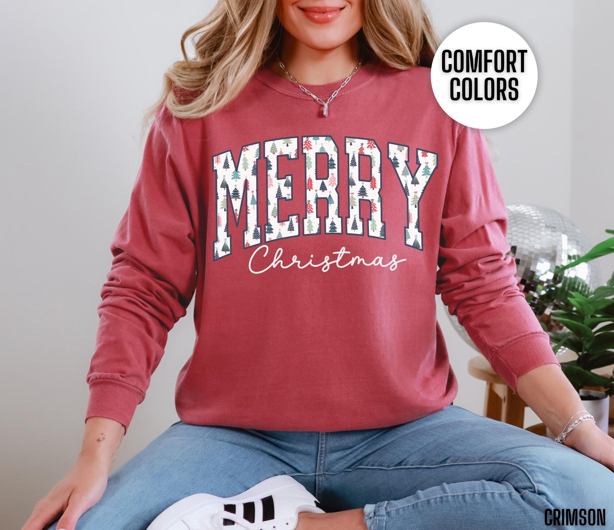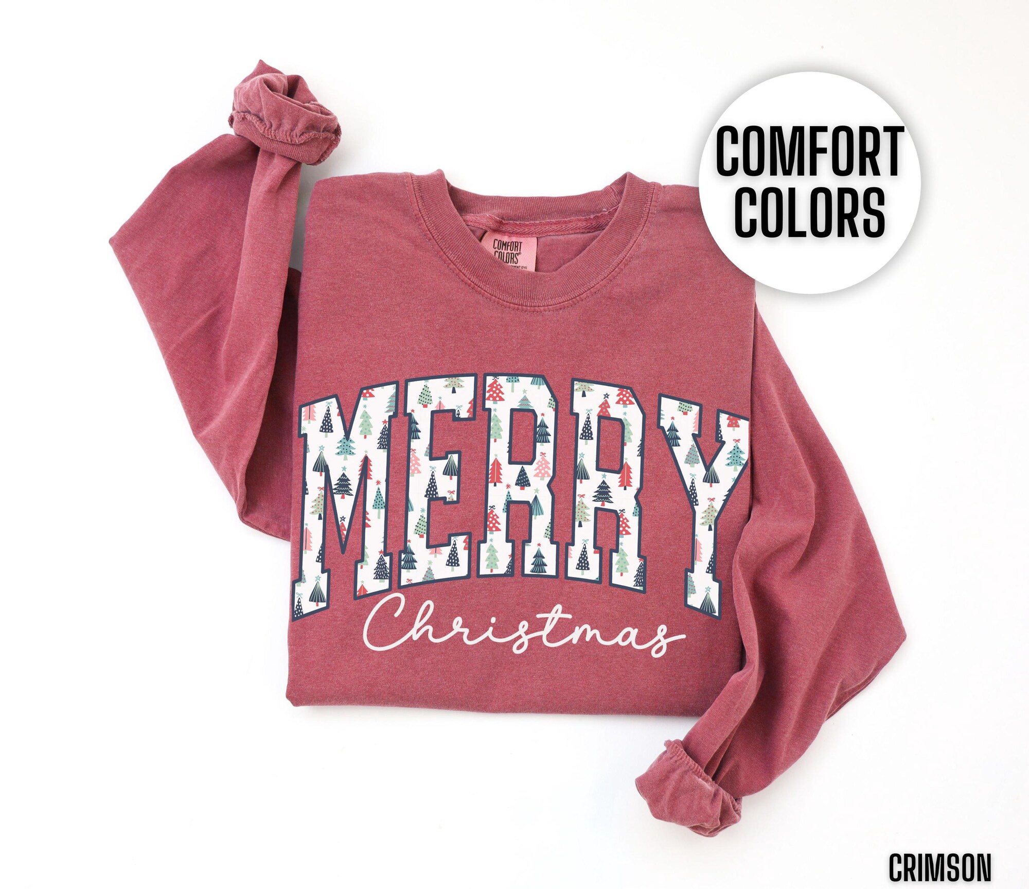 You will love our Comfort Colors Merry Christmas long sleeve t shirt for women. It says, Merry Christmas in a Christmas tree block font. This long sleeve holiday tee would make a great gift for any lady who loves Christmas. It comes in 4 beautiful Comfort Colors brand t shirt colors, blue spruce, light green, crimson and true navy. Stay on trend with this popular holiday t-shirt this winter. Find our short sleeve tee and our crewneck sweatshirt here: