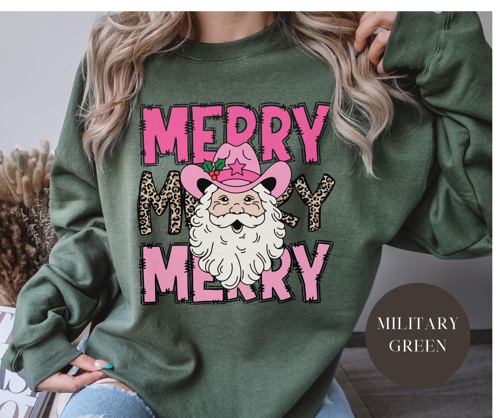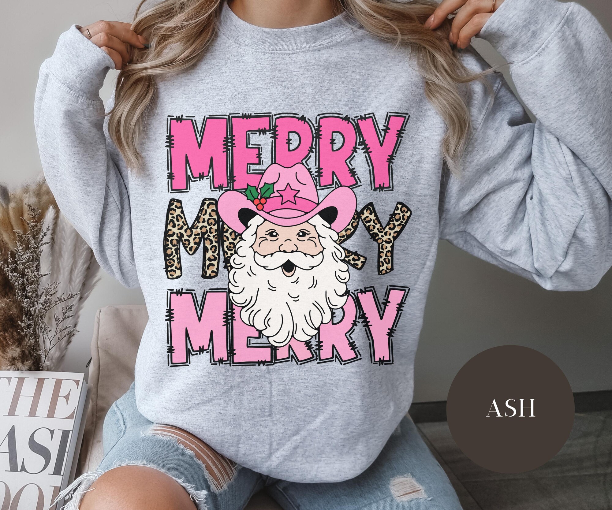 Merry Christmas Pink Cowboy Santa Sweatshirt, Leopard Western, Coquette Holiday, Western Lover Gift, Retro Vintage Style Howdy Cowgirl