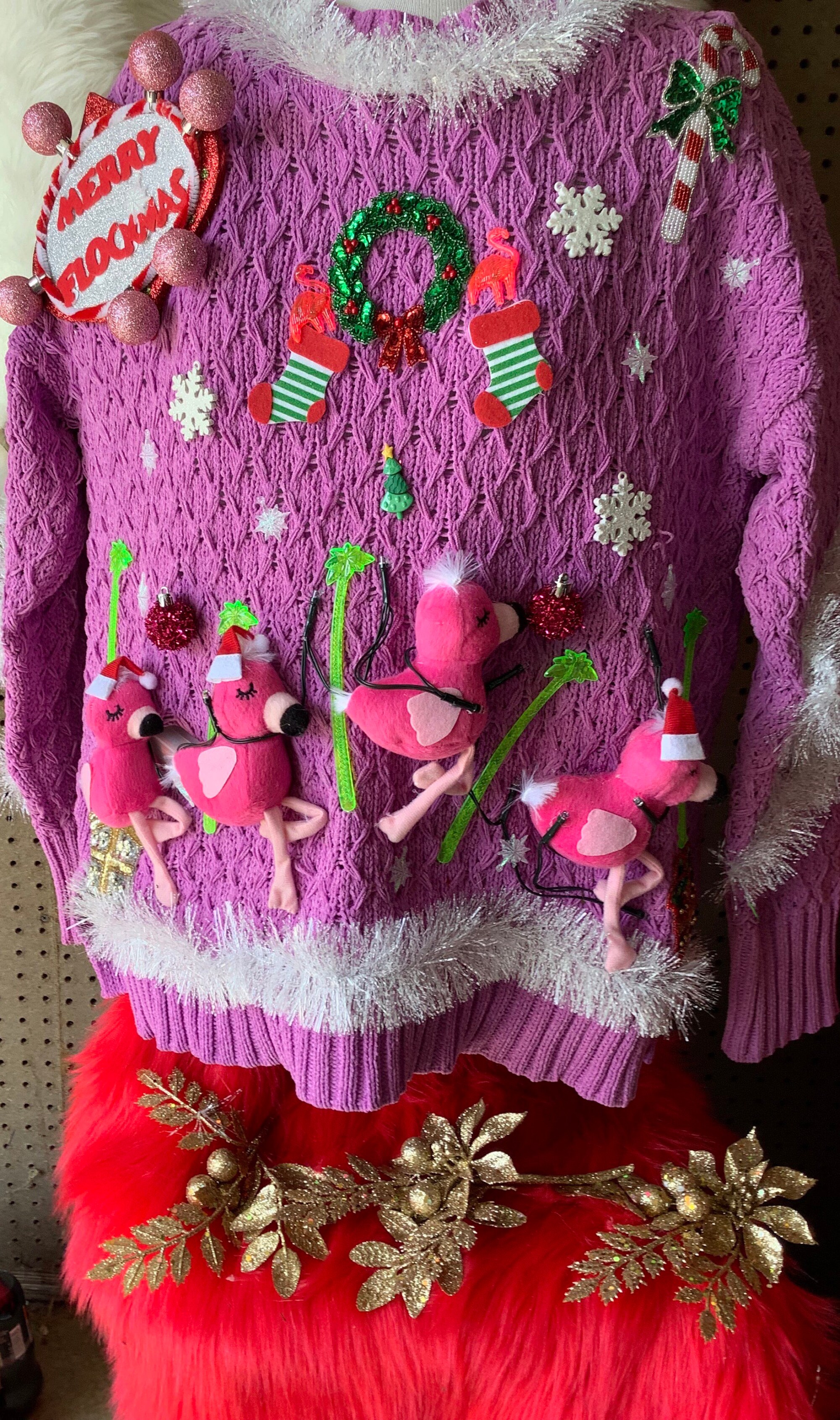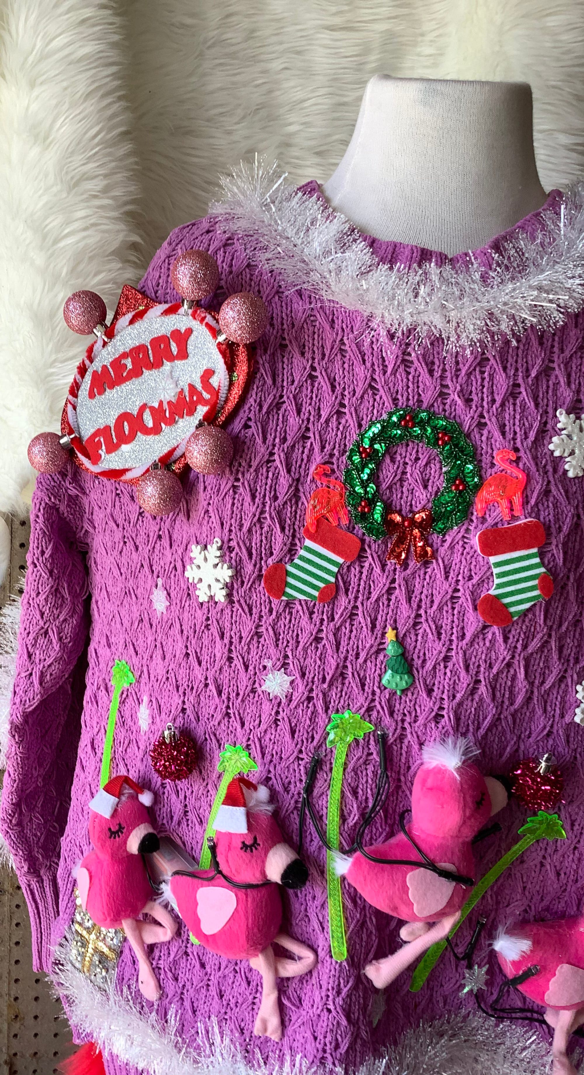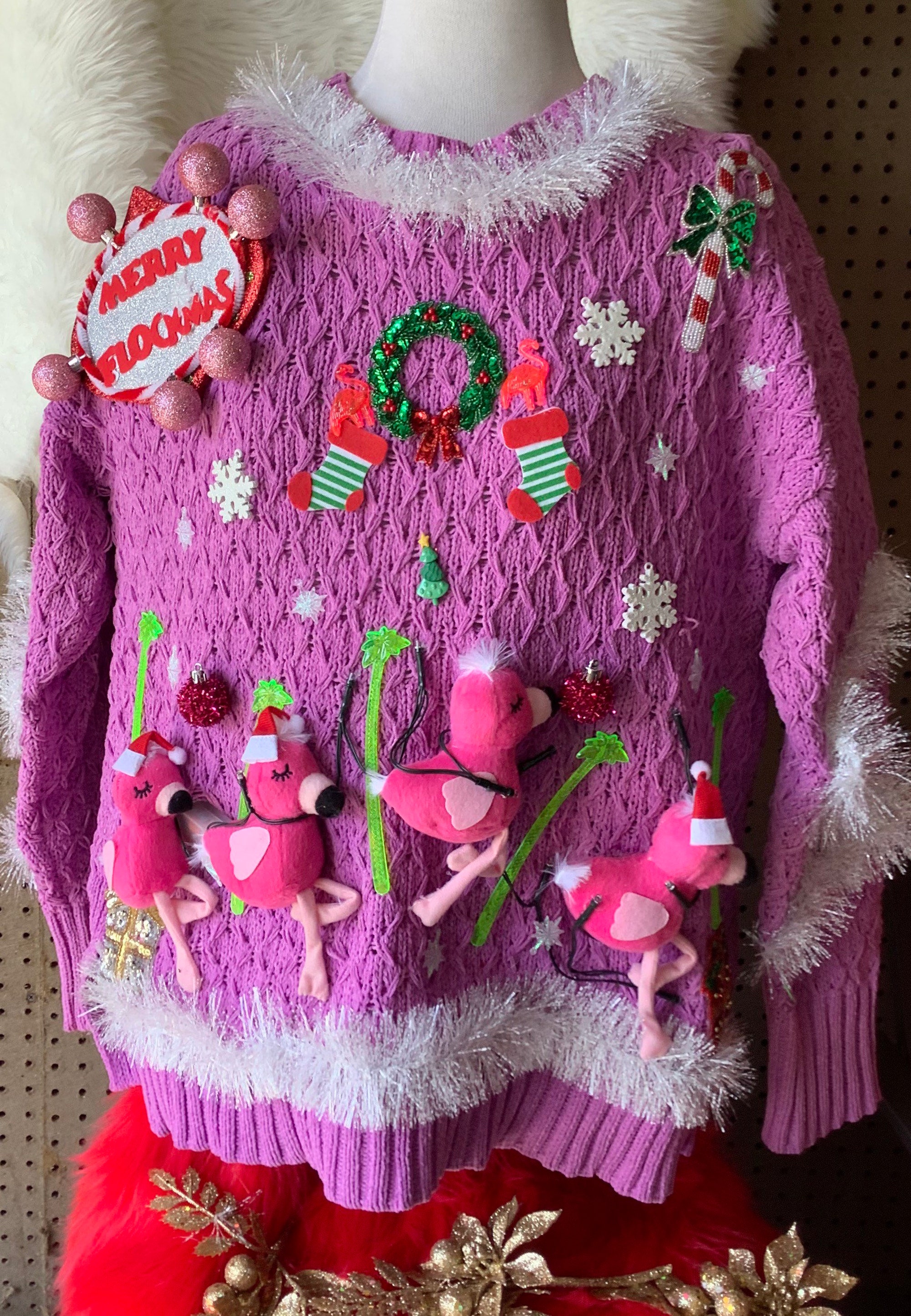 Merry Flockmas Flamingo Ugly Christmas Sweater: Tacky Light-Up Party