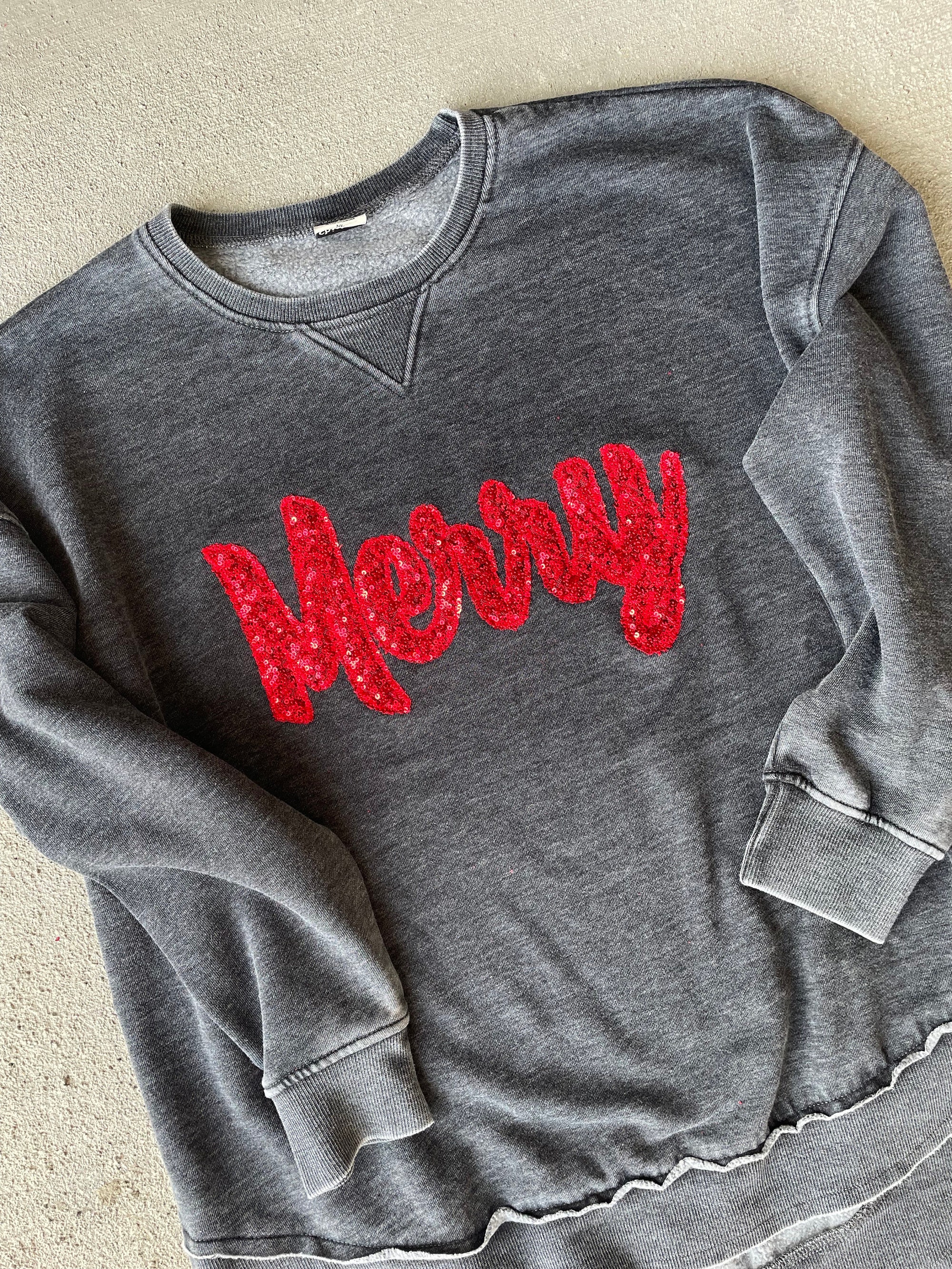 ‘Merry’ sequin sweatshirt featuring a festive red sequin fabric! This sweatshirt is stunning! The sweatshirt is oversized and super soft! It has a rounded hem a...