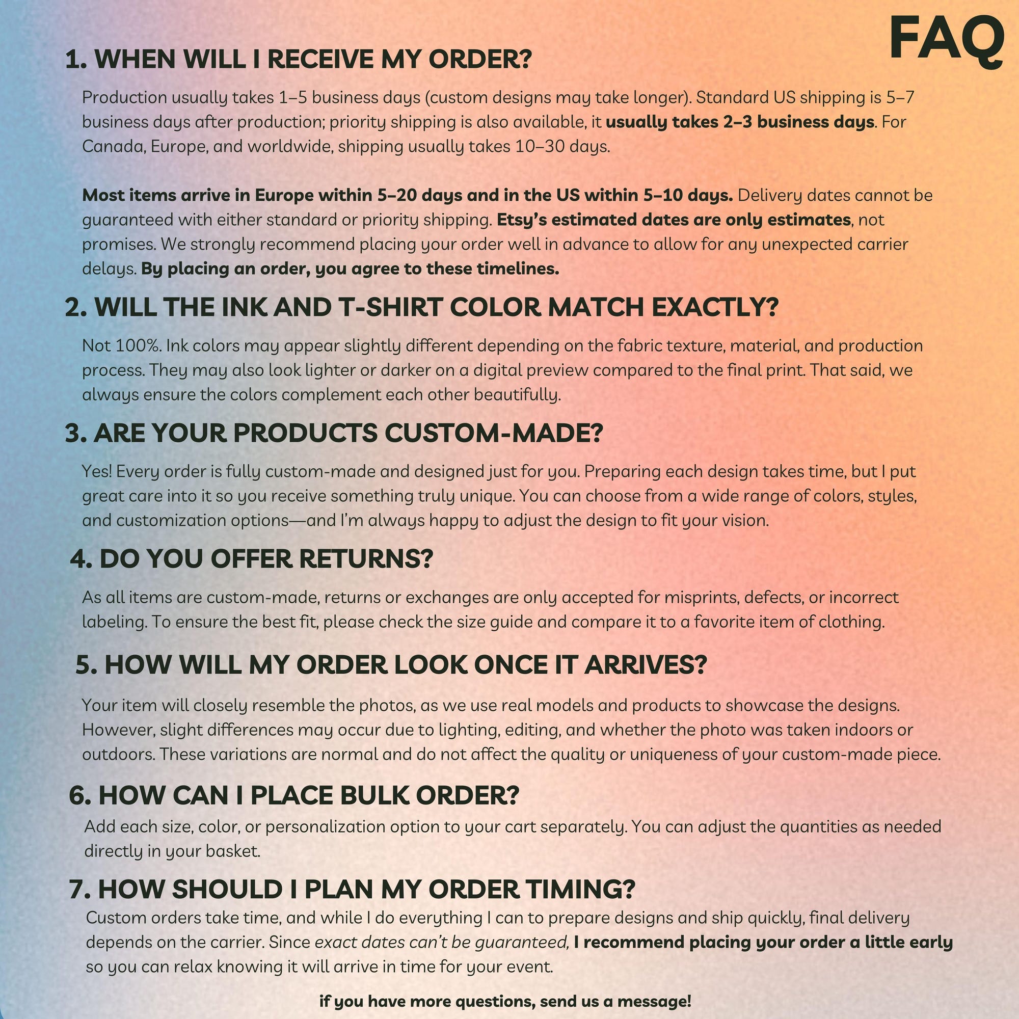 • Europe: 5-30 days (up to 30 business days, depending on the color) – – feel free to message us for more info!