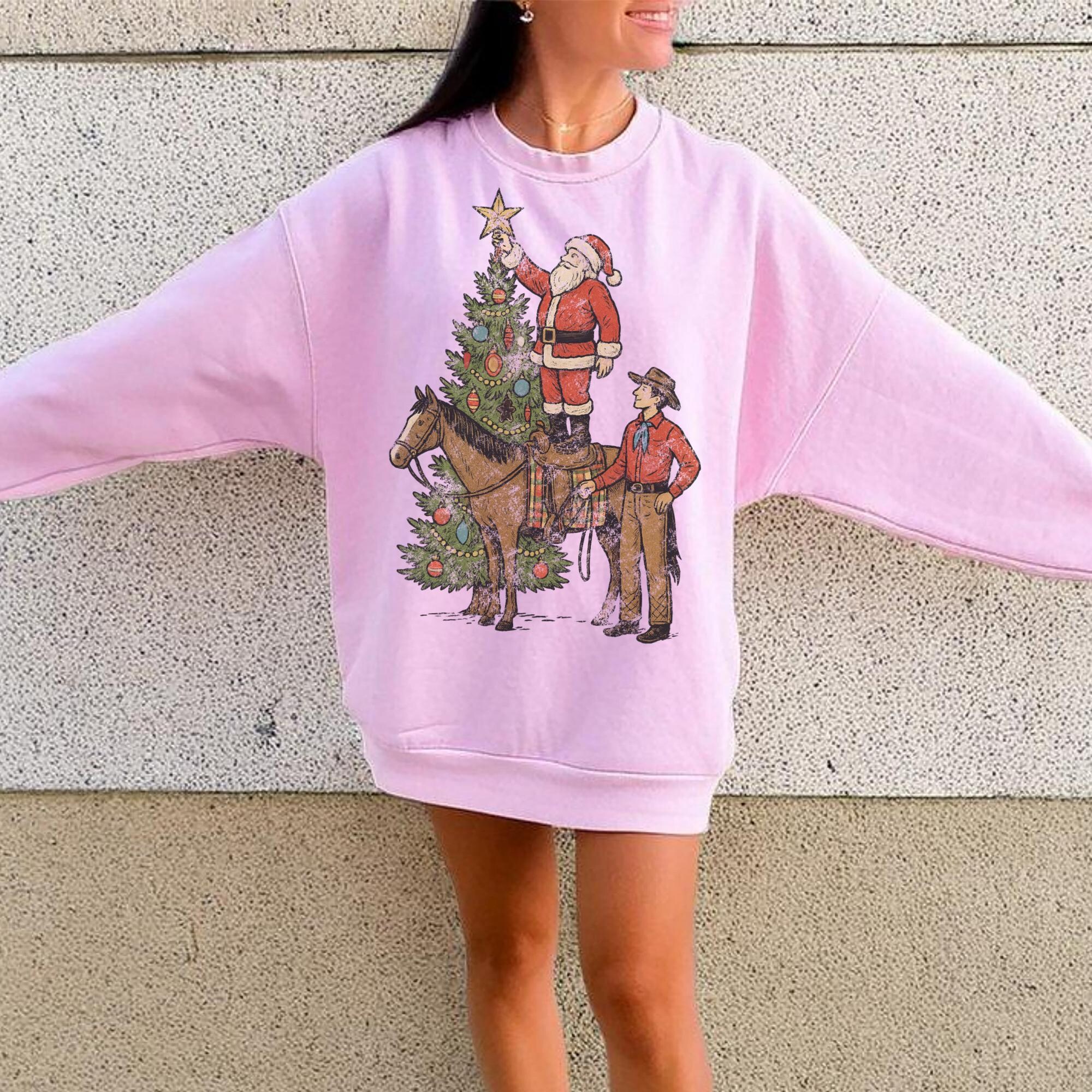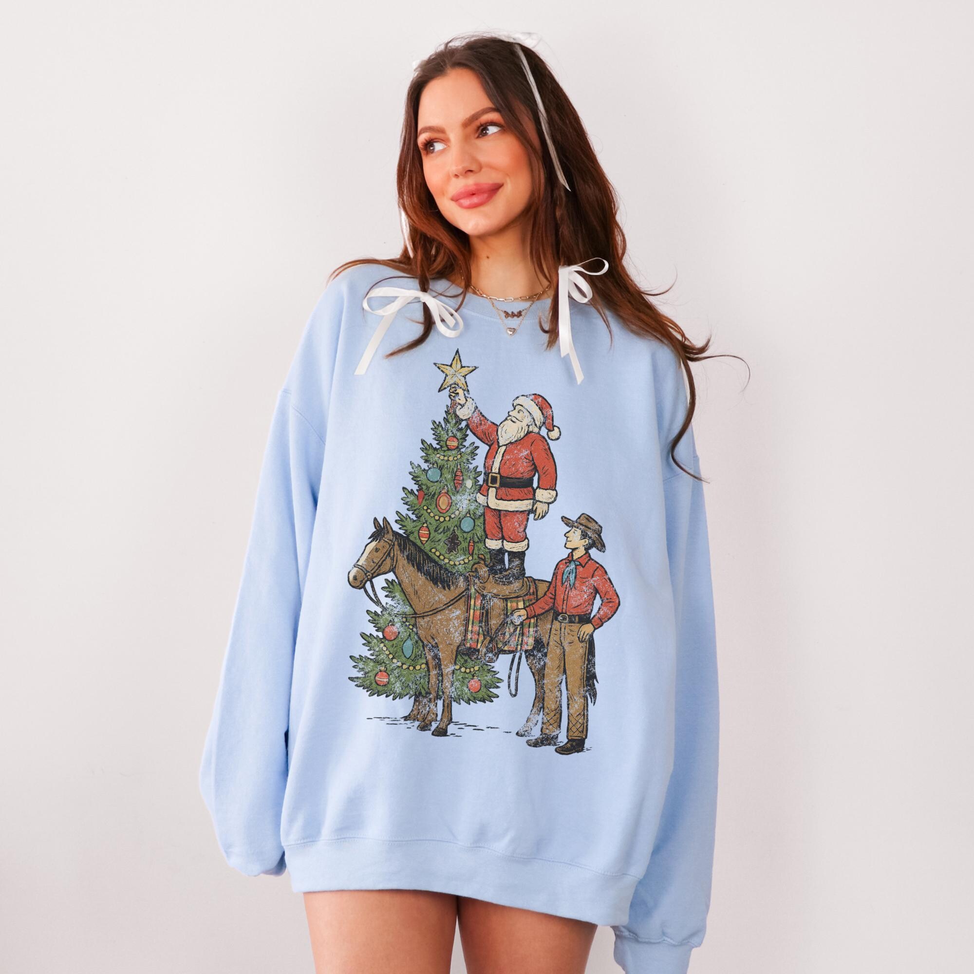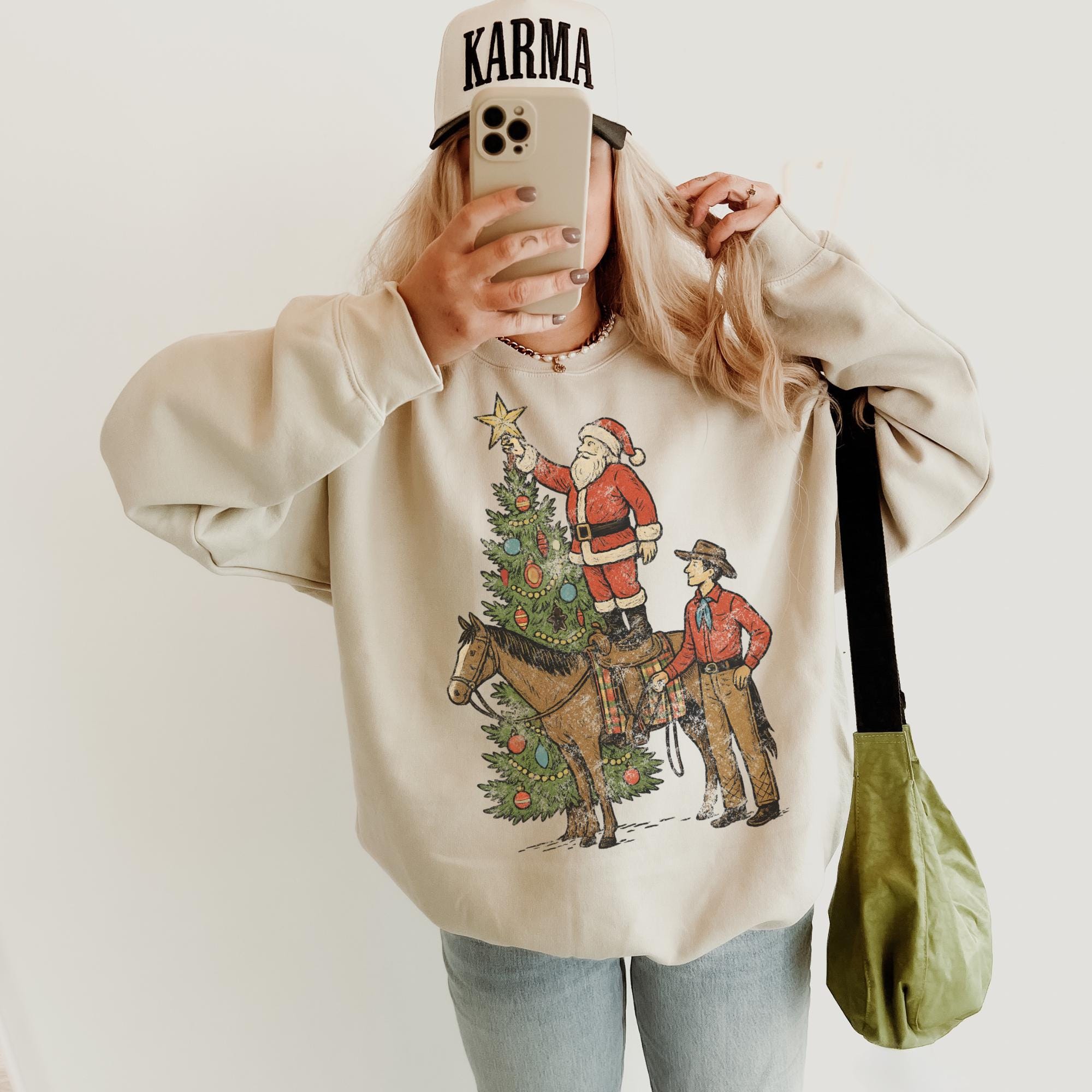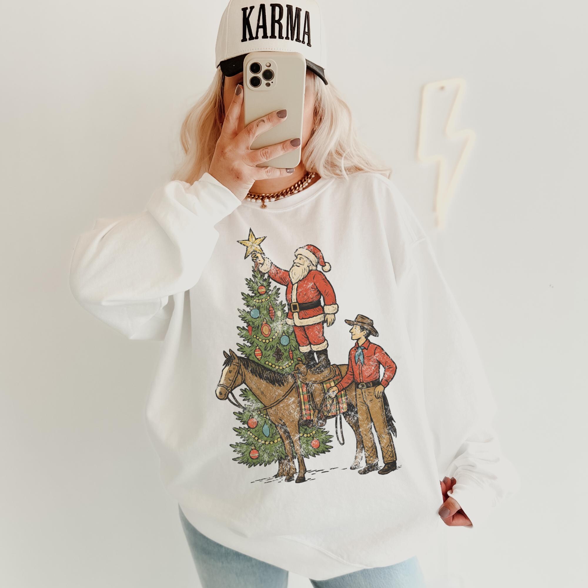 Retro Cowboy Christmas Sweatshirt Trendy Western Santa Christmas Crewneck Cute Western Holiday Sweatshirt Country Christmas Cowgirl Xmas