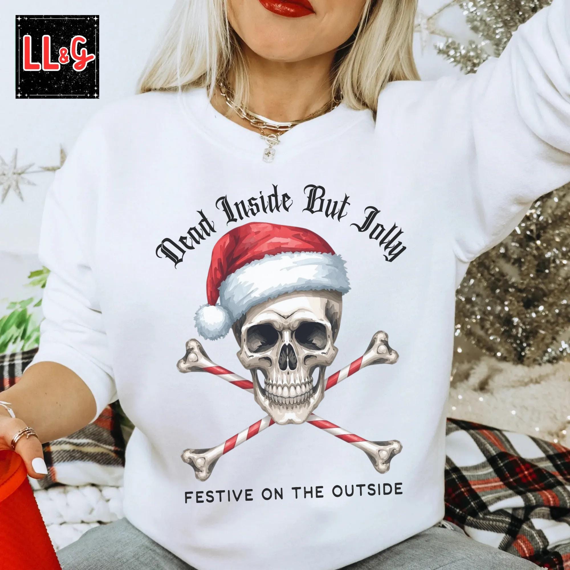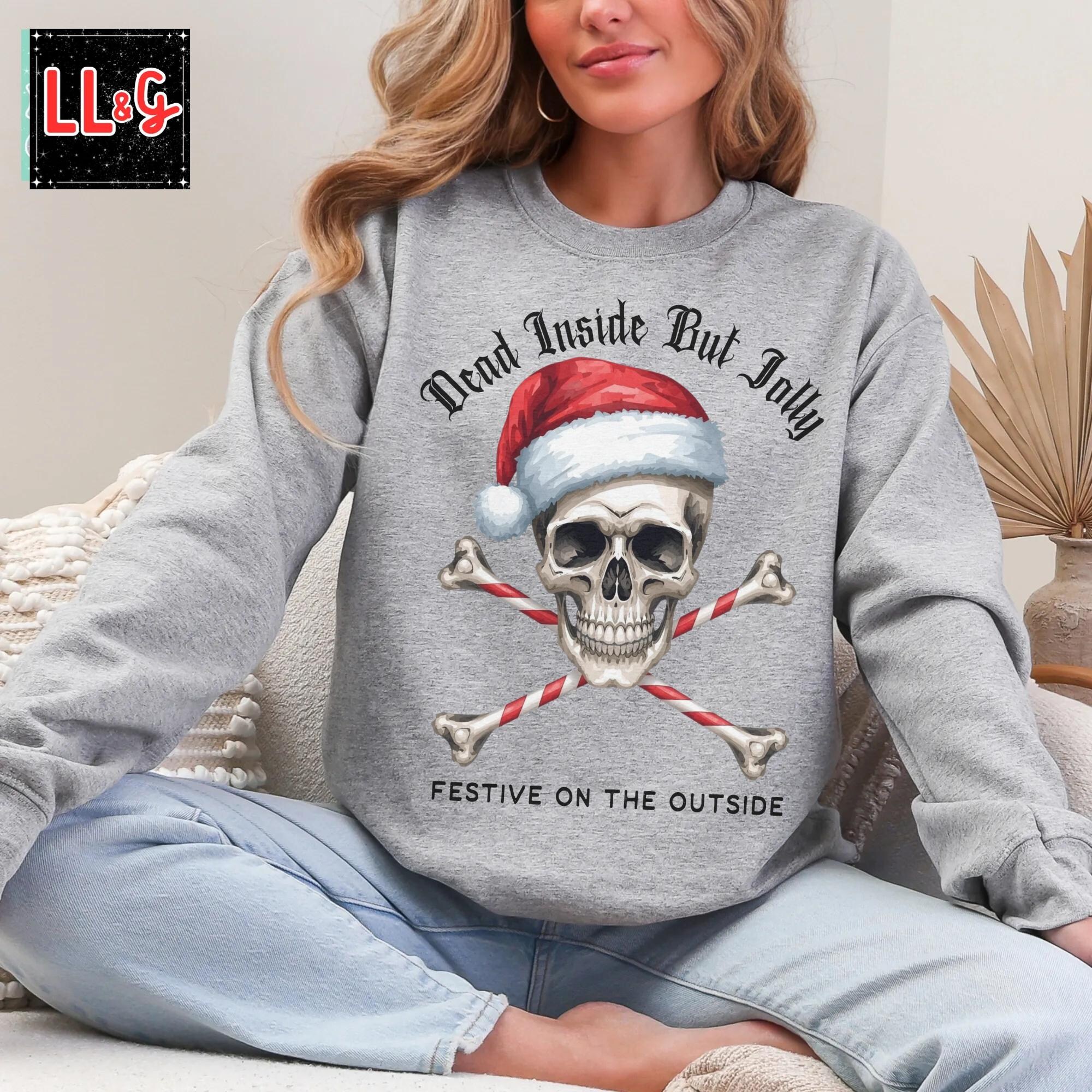 Dead Inside But Jolly, Festive on the Outside – Santa Skeleton Shirt Gothic Christmas Sweatshirt Creepmas Scary Christmas Shirt Dark Christmas Gifts Goth Clothing for Her Him Sarcastic Shirts with Sayings Plus Sizes Up to 5X Unisex Crewneck Sweatshirt