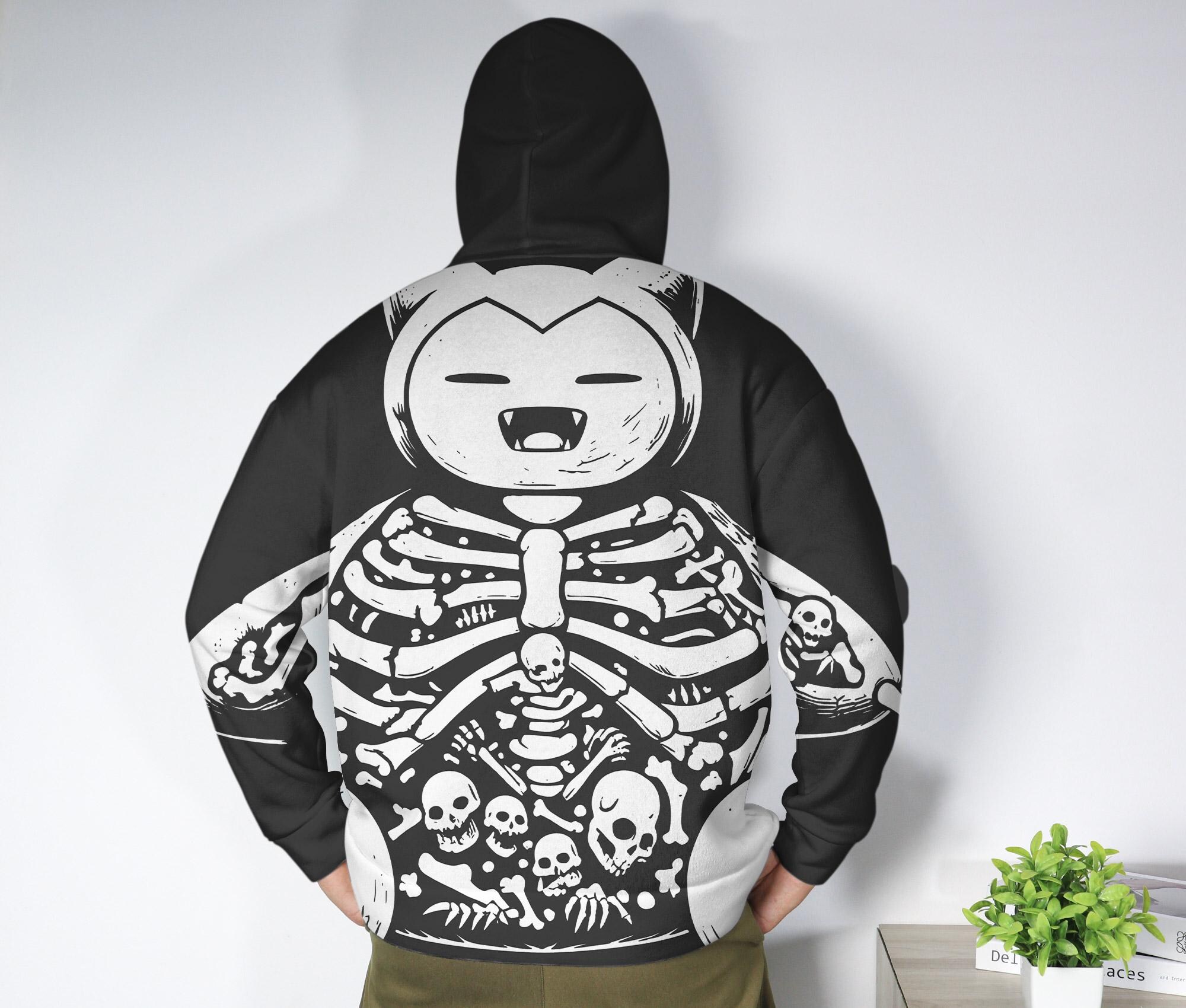 Add a spooky twist to your wardrobe with this Snorlax-inspired hoodie or sweatshirt, featuring a bold skeleton-themed design in classic black and white. The front and back showcase Snorlax with a skeleton print filled with skull details, creating a striking blend of cute and edgy streetwear style. Crafted from premium polyester, this hoodie and sweatshirt is lightweight, soft, and breathable, offering comfort for everyday wear or cozy lounging. Available in both hoodie and crewneck sweatshirt styles, it’s the perfect mix of playful design and standout fashion.