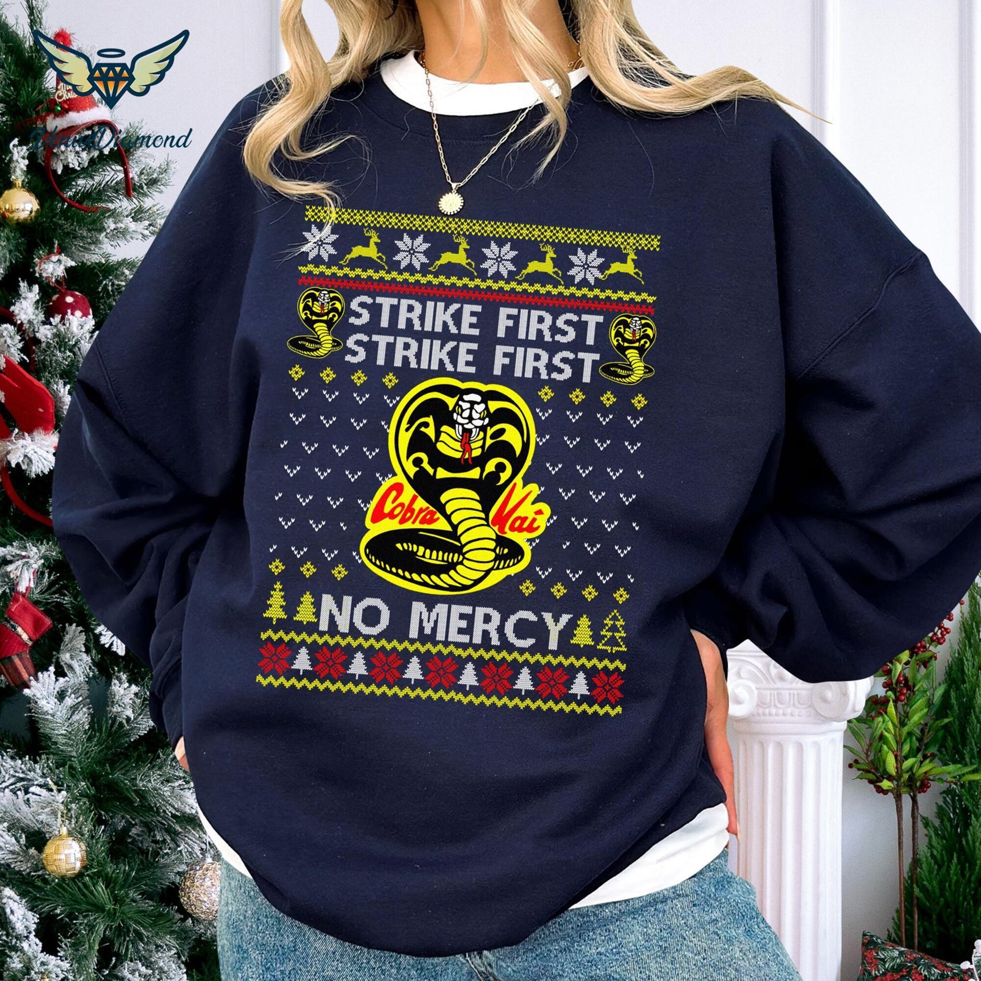 Strike First No Mercy Ugly Christmas Sweatshirt, Funny T Shirt, Cobra Kai Lovers Shirt, Karate Kid Movie T Shirt, Christmas Gifts