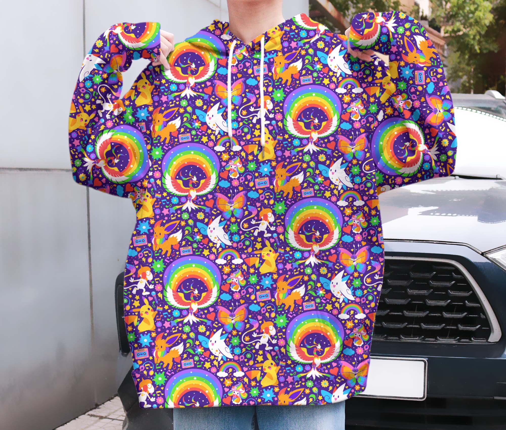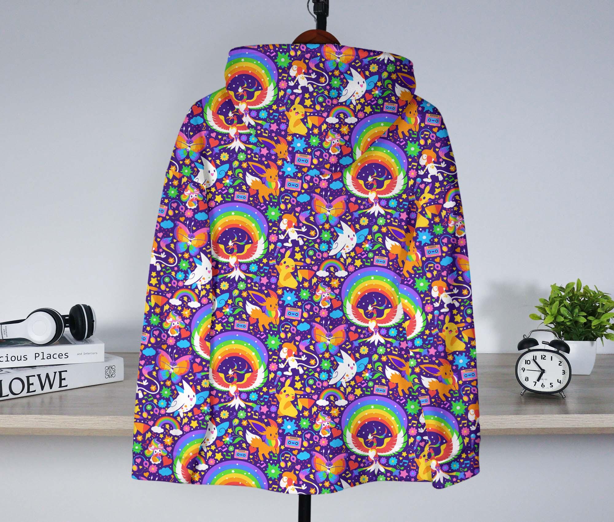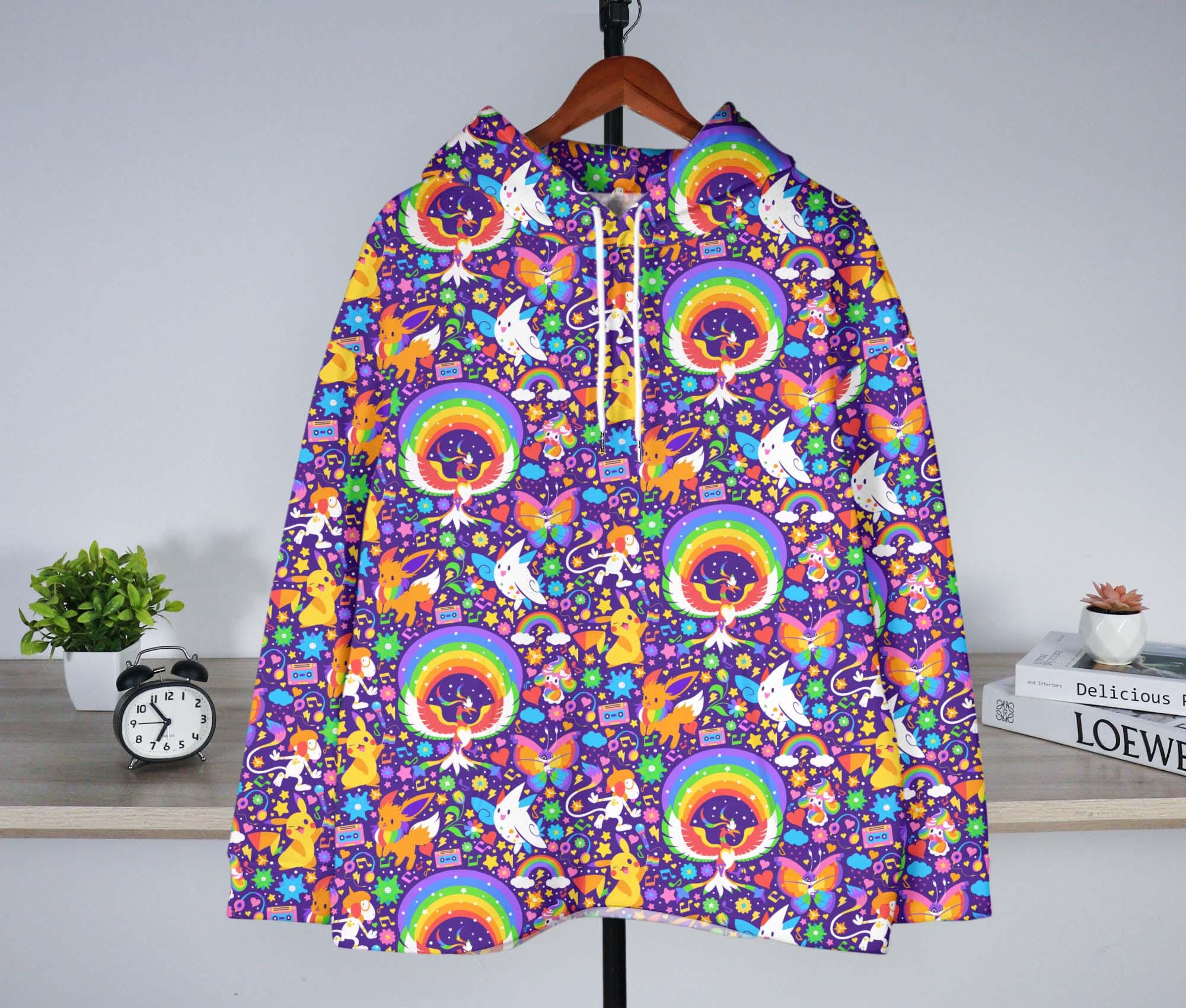 Bring color and fun to your style with this Pikachu and Ho-oh hoodie! Designed with a bold all-over print featuring rainbows, butterflies, and vibrant details, this hoodie is perfect for anyone who loves cute and playful fashion. Made from premium soft fabric, it offers comfort for everyday wear while making a statement with its eye-catching design.
