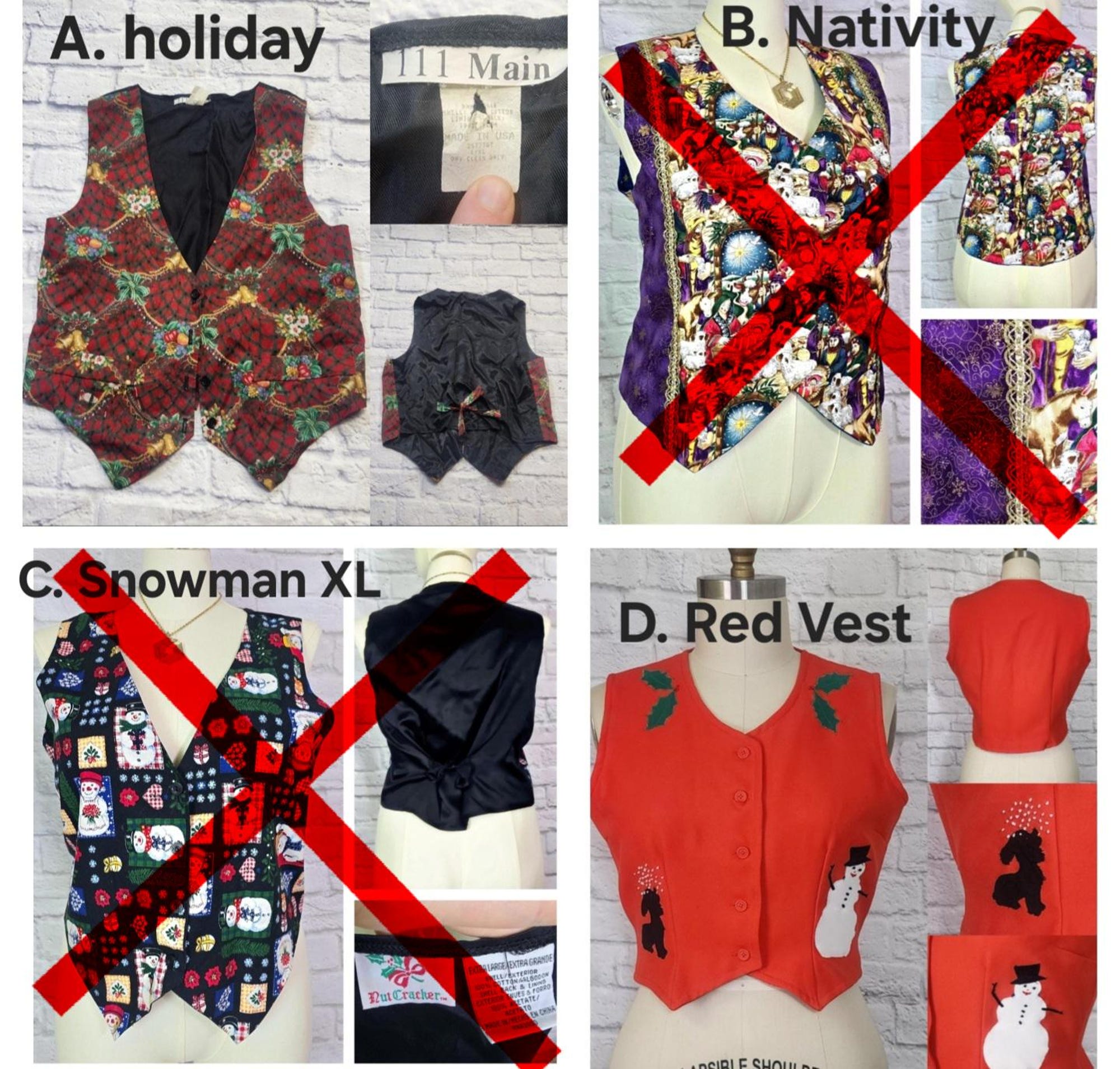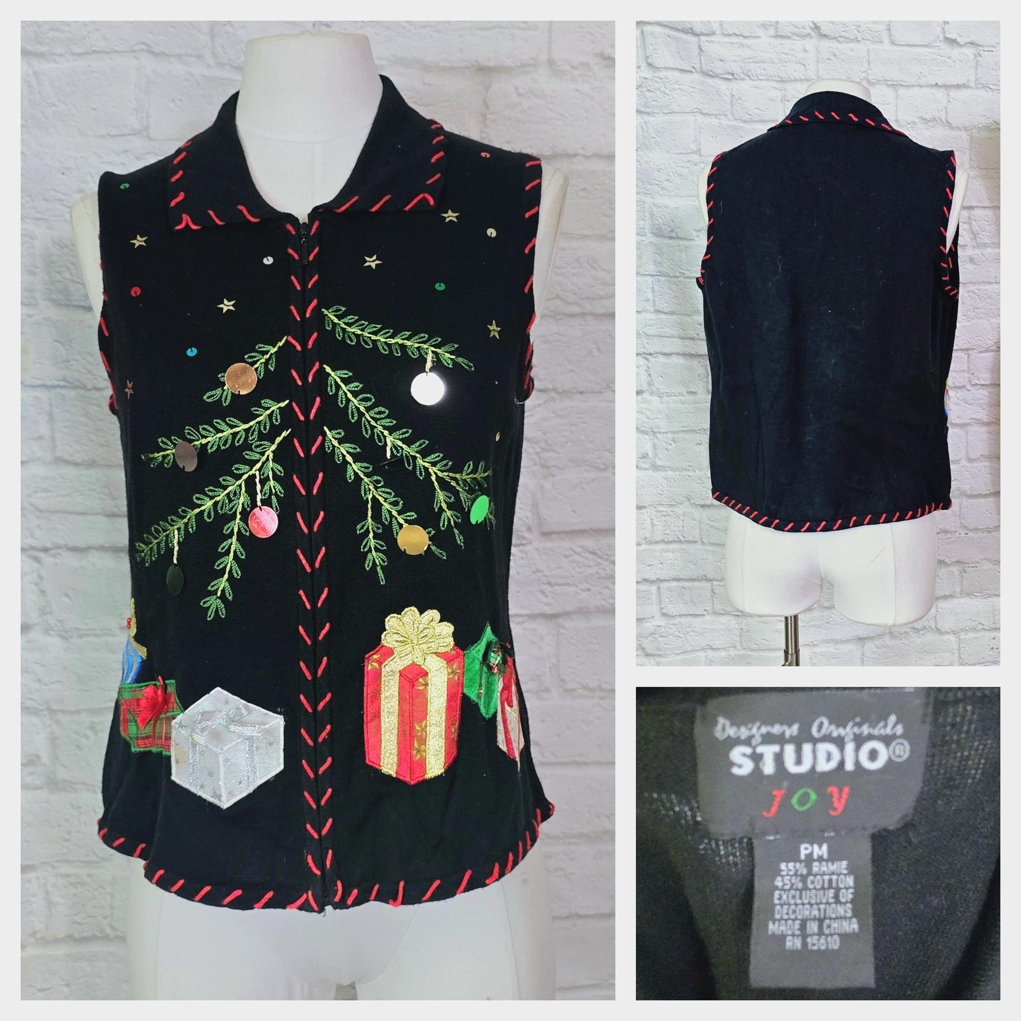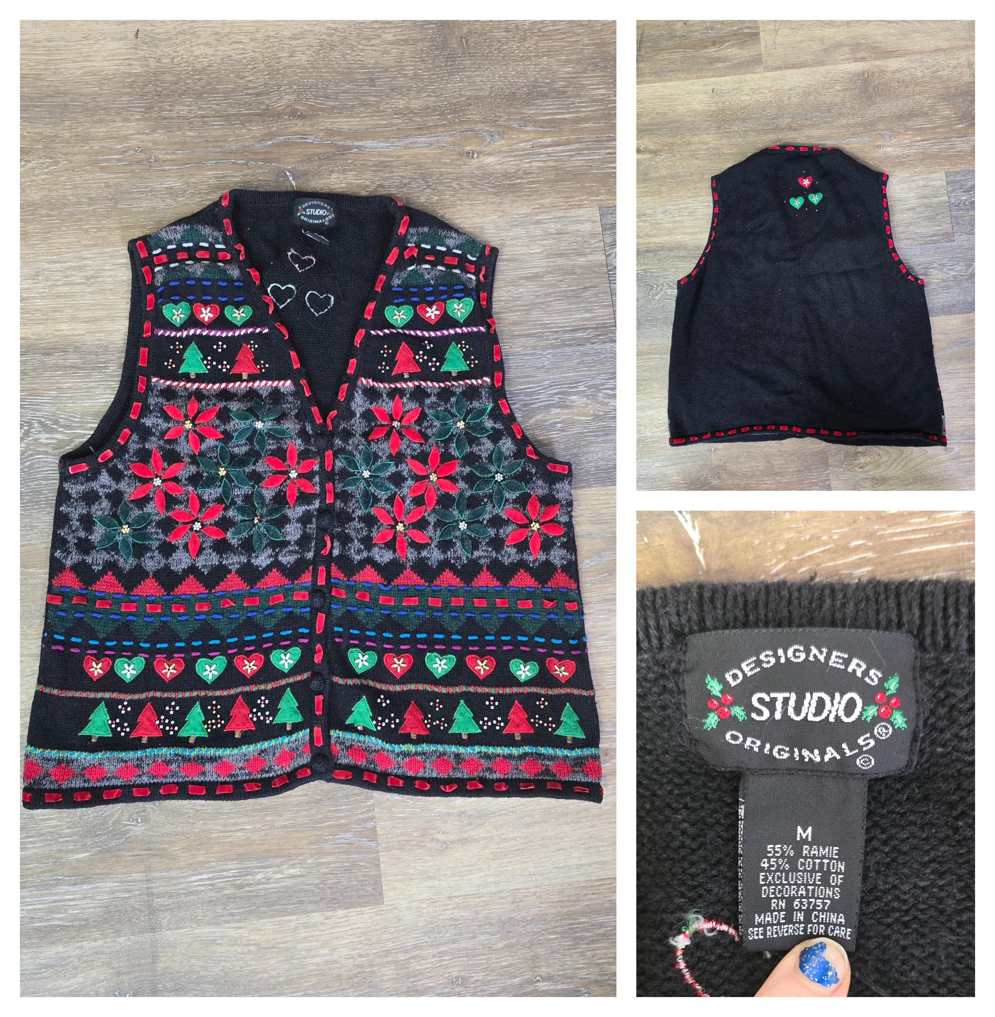 U Pick! Ugly Christmas Vests & Sweaters, knit cotton Rami acrylic Beaded Santa Snowman Poinsettia Snow Flake Novelty 1990s All Sizes