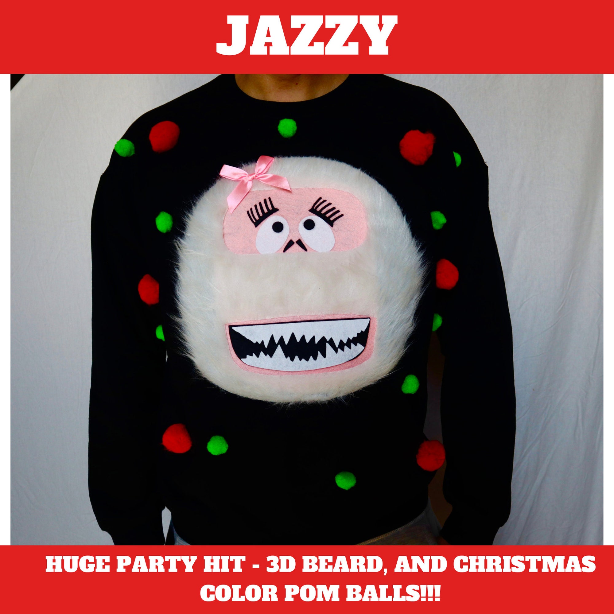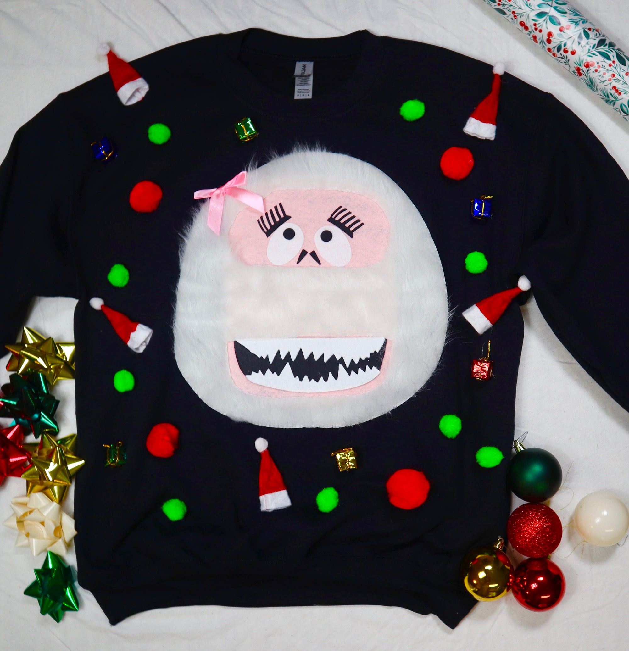 This sweater features the ferocious abominable snowman! Hand crafted pattern on a 50% cotton 50% polyester sweatshirt (yes, it’s a sweatshirt not a sweater, but let’s be real.. nobody says “ugly sweatshirt!)