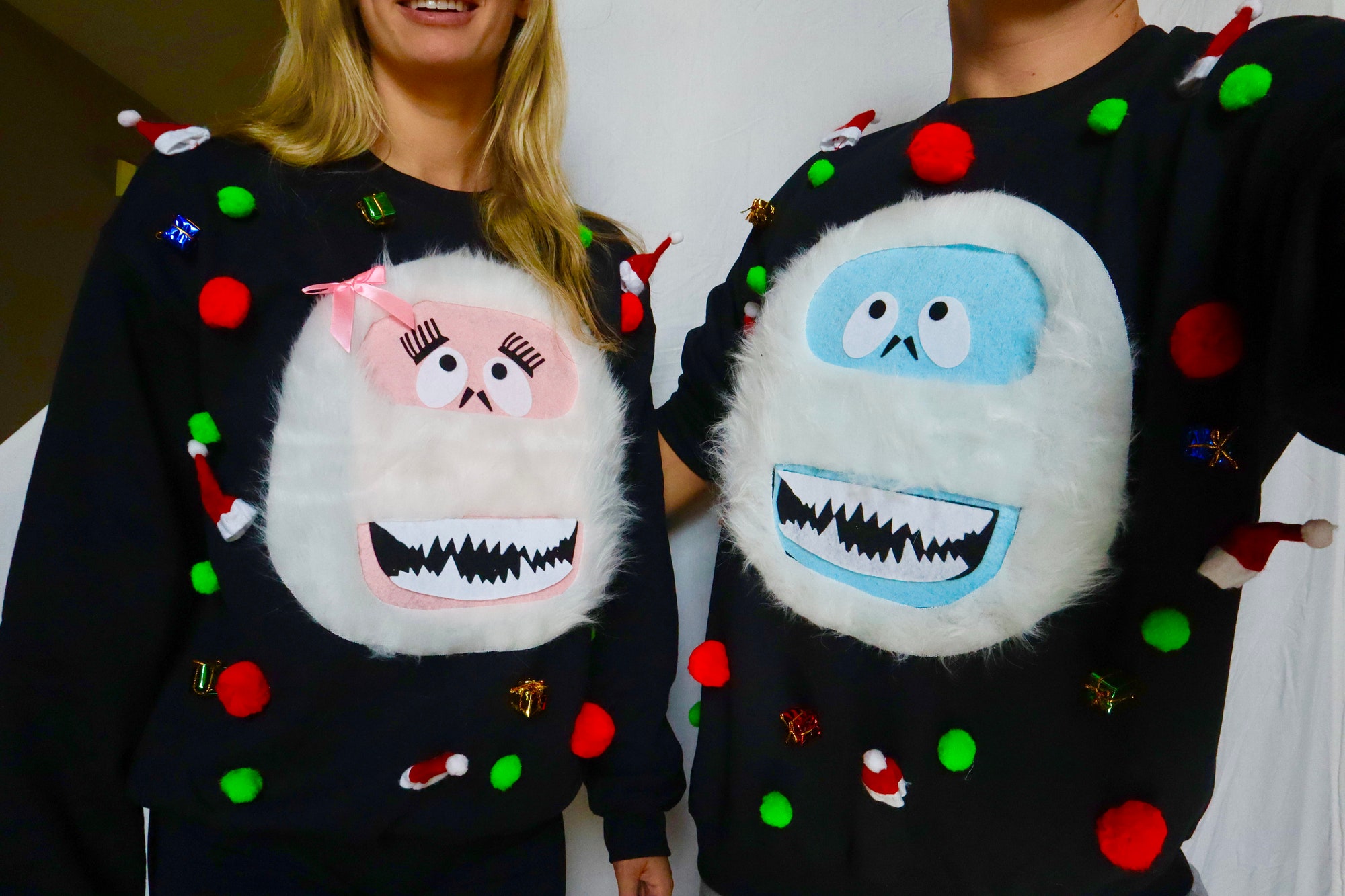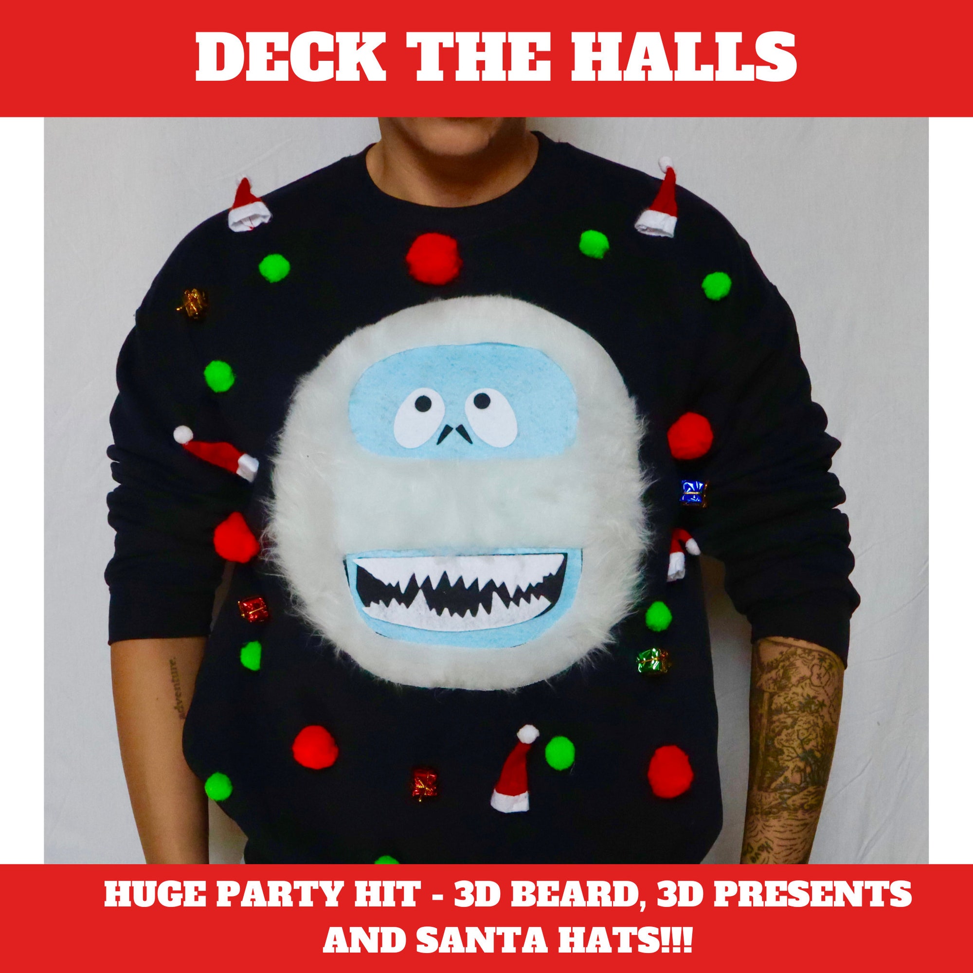 This sweater features the ferocious abominable snowman! Hand crafted pattern on a 50% cotton 50% polyester sweatshirt (yes, it’s a sweatshirt not a sweater, but let’s be real.. nobody says “ugly sweatshirt!)
