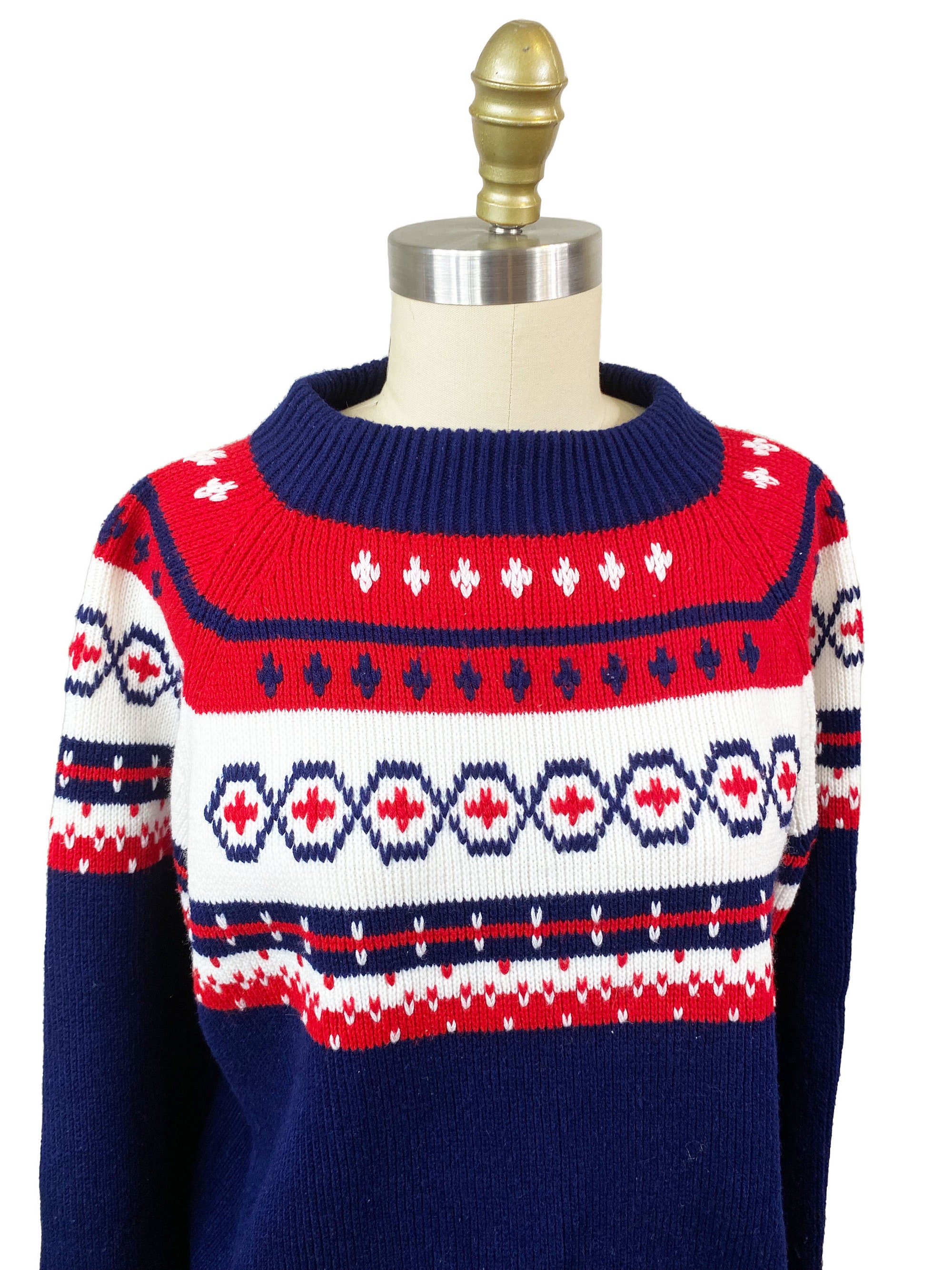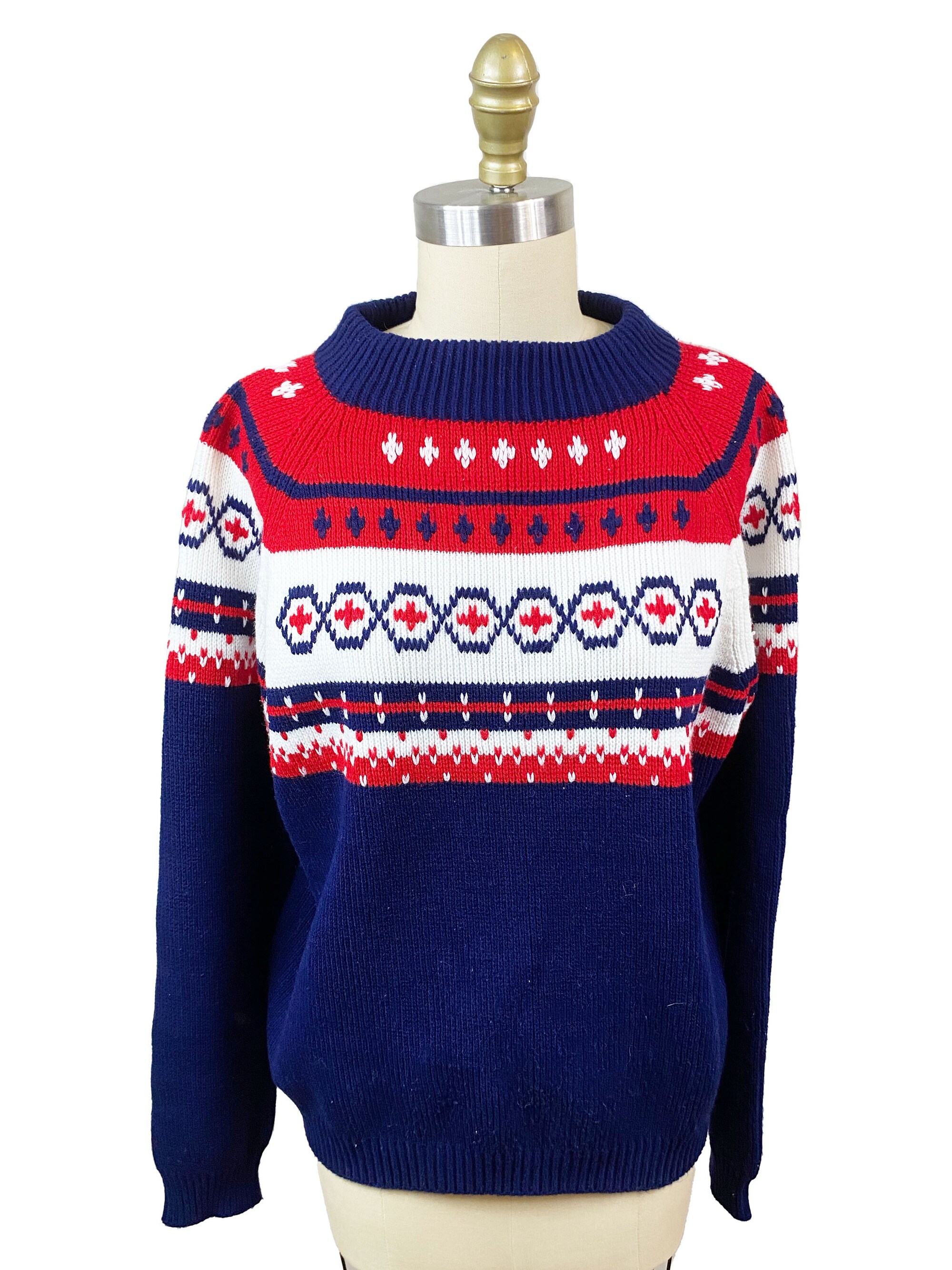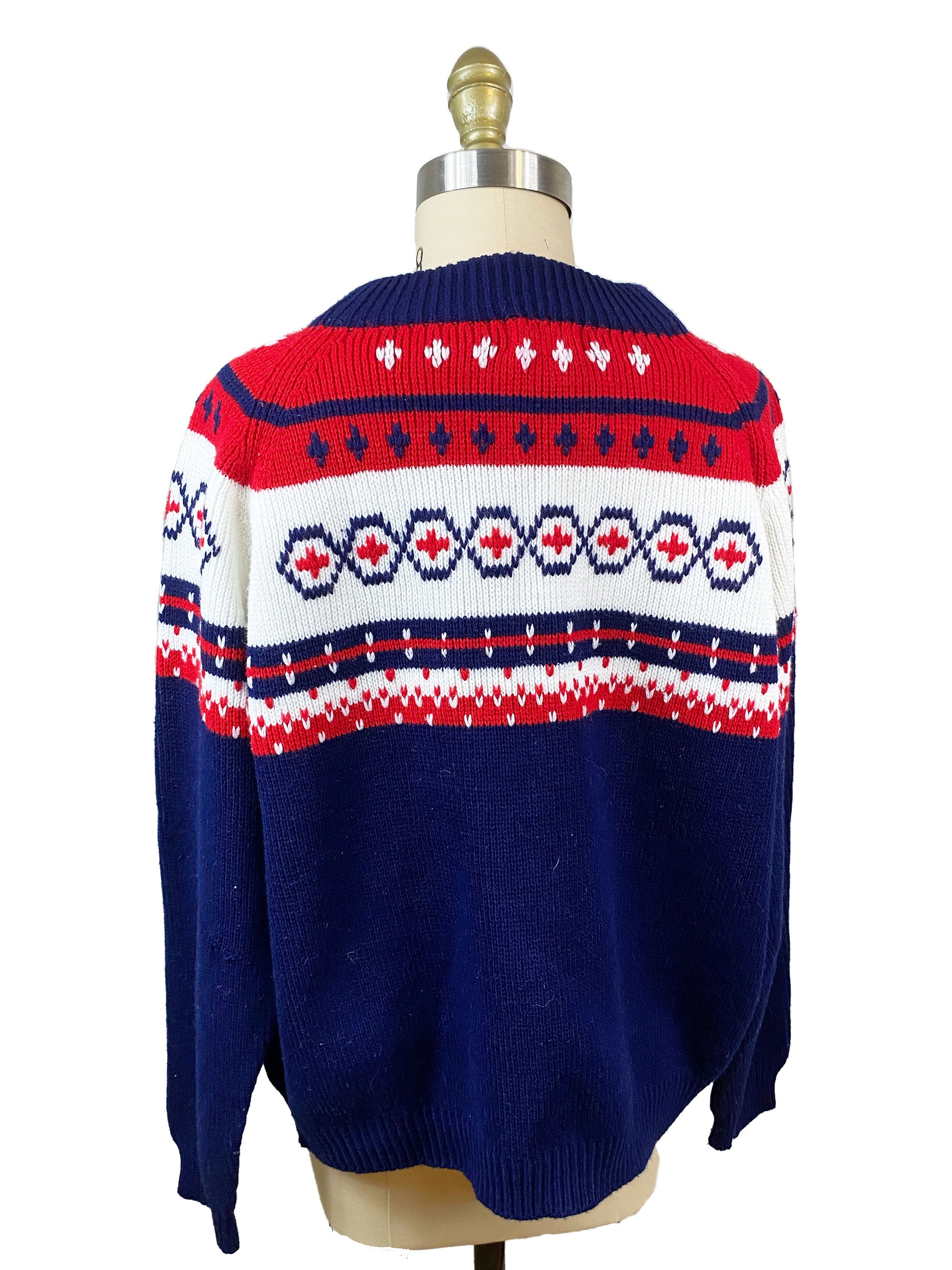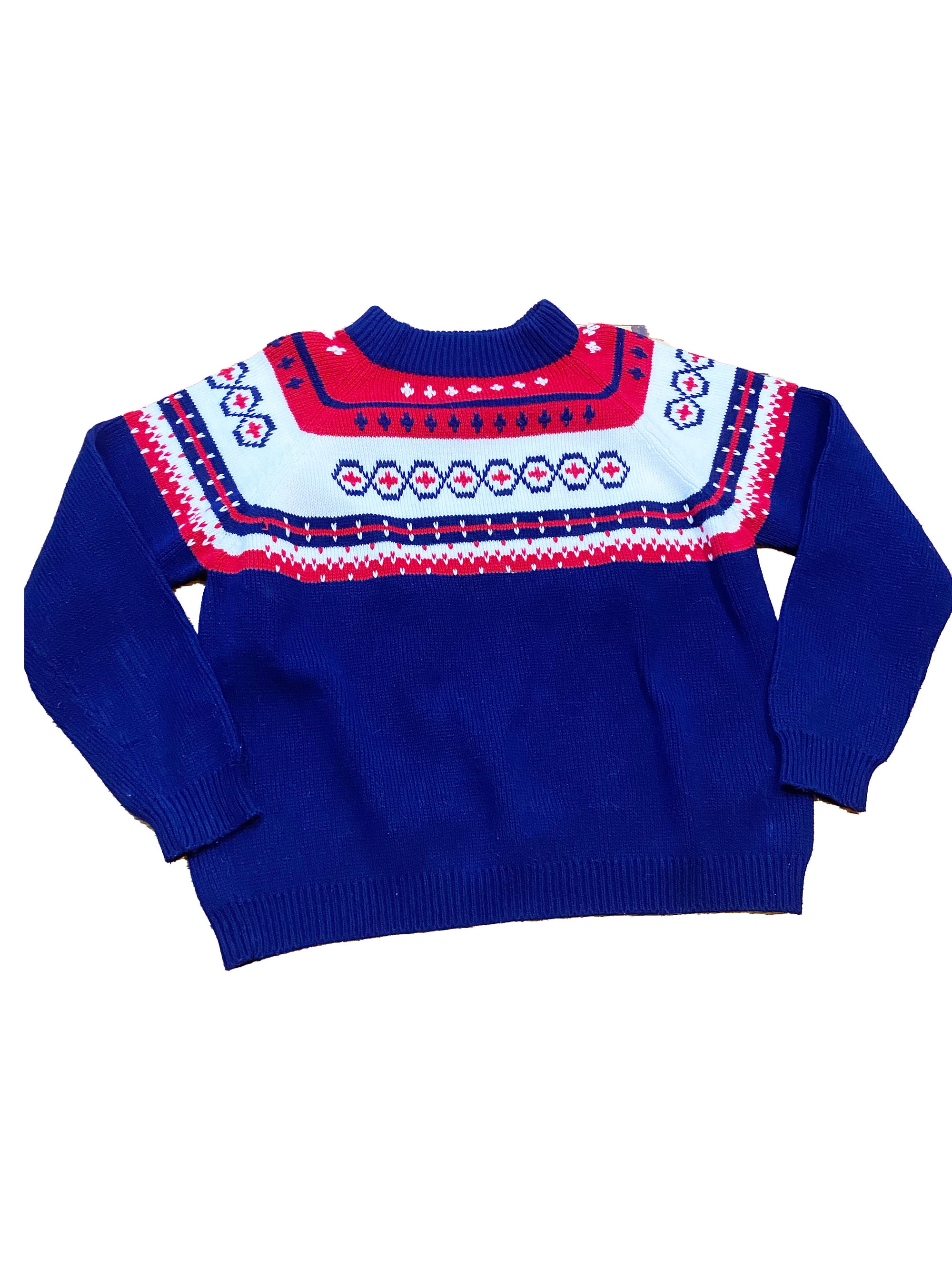 Vintage 1970s 1960s Mens Pullover Sweater – Navy Blue White Red Holiday Christmas Print Acrylic Knitwear Size: XL