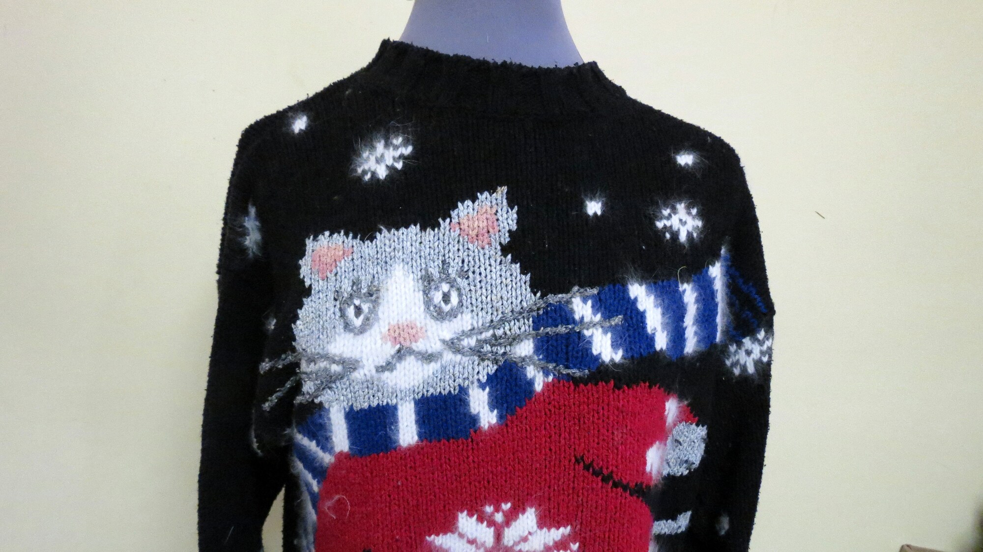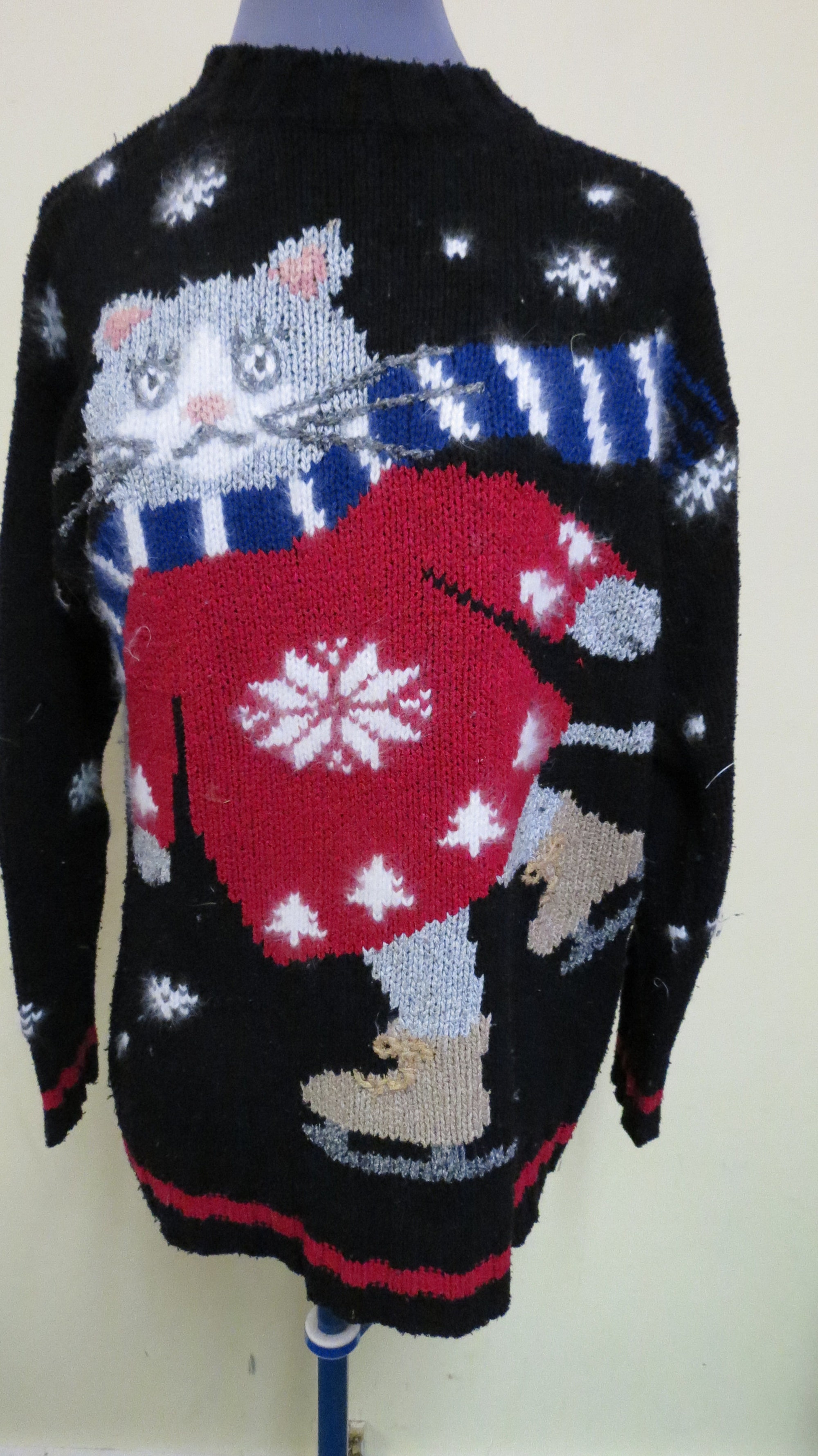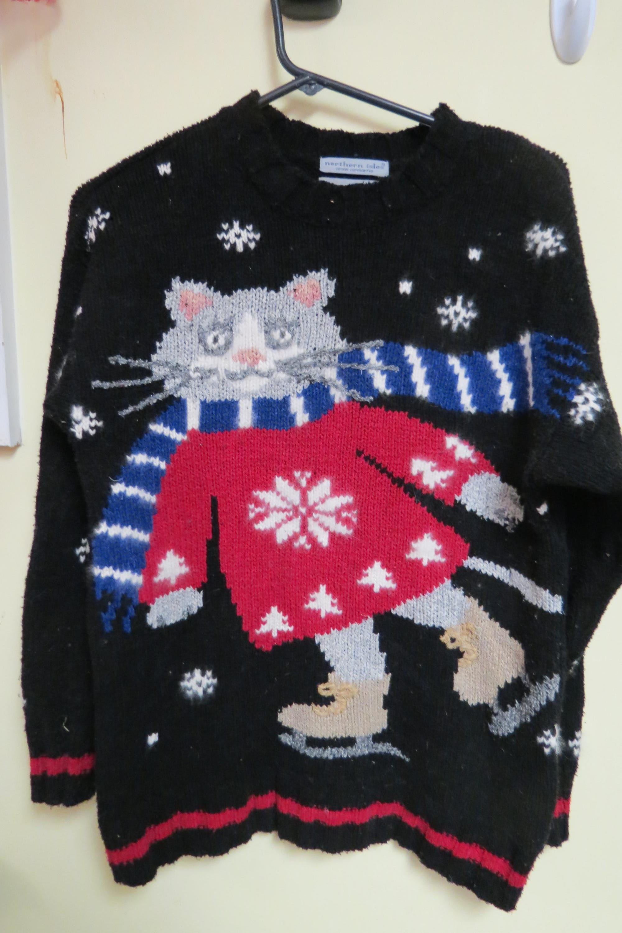 Vintage Cat Tacky Ugly Christmas Sweater Famous Skating Cat Hand Knit, Size Small, Wal-mart Advertisement sweater