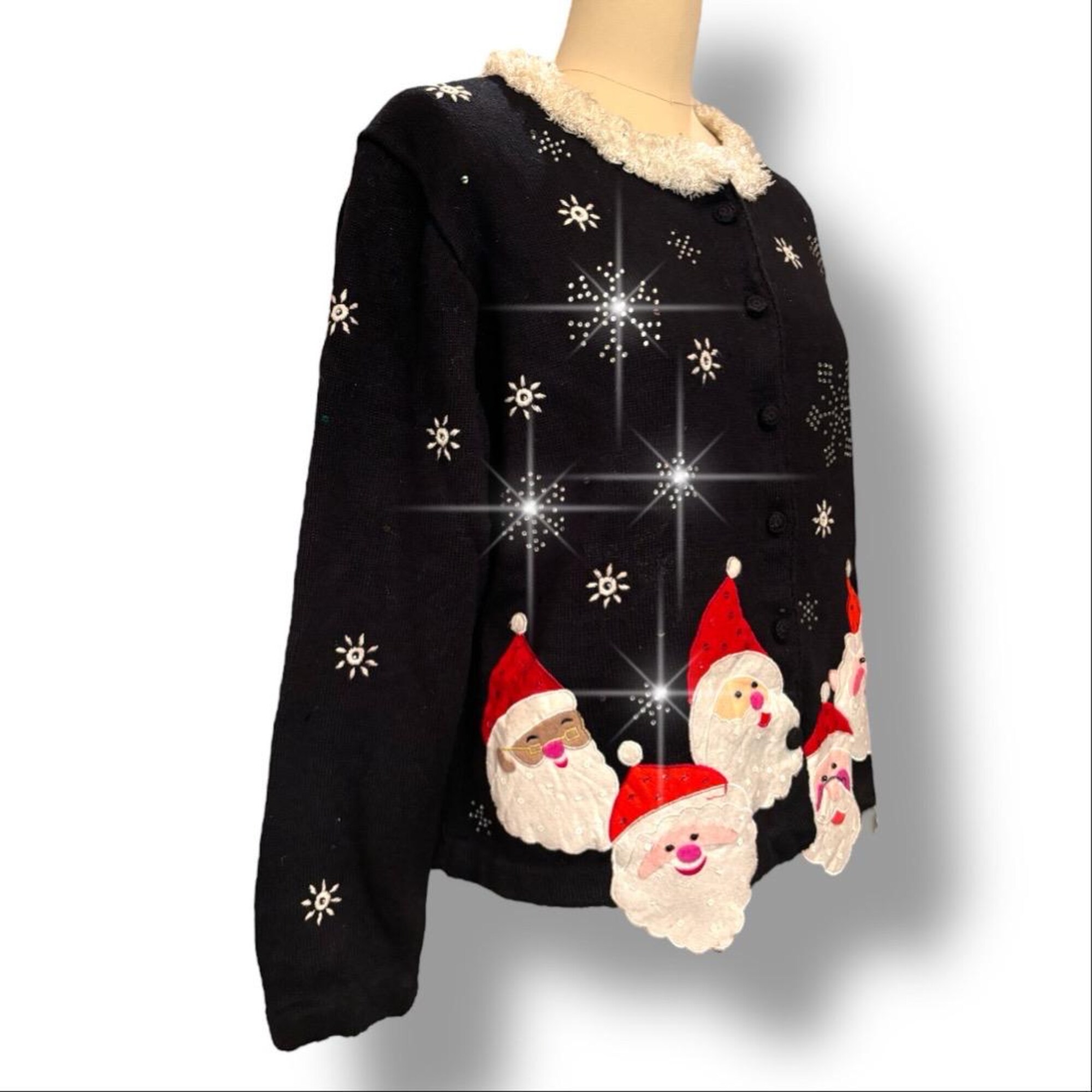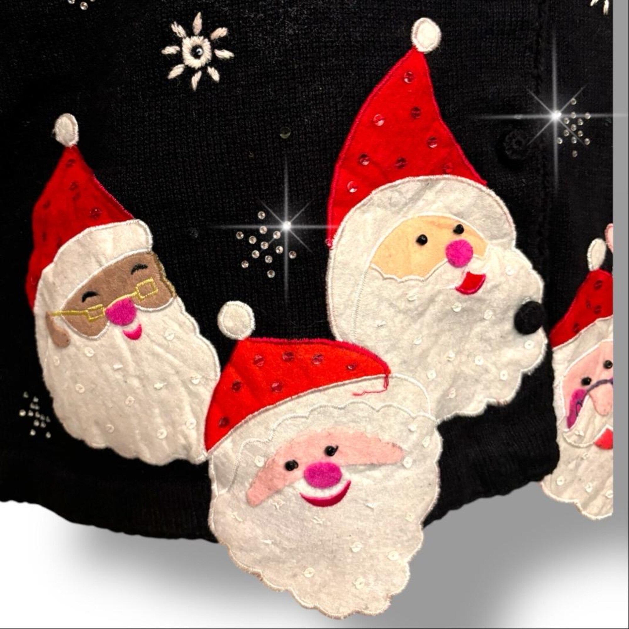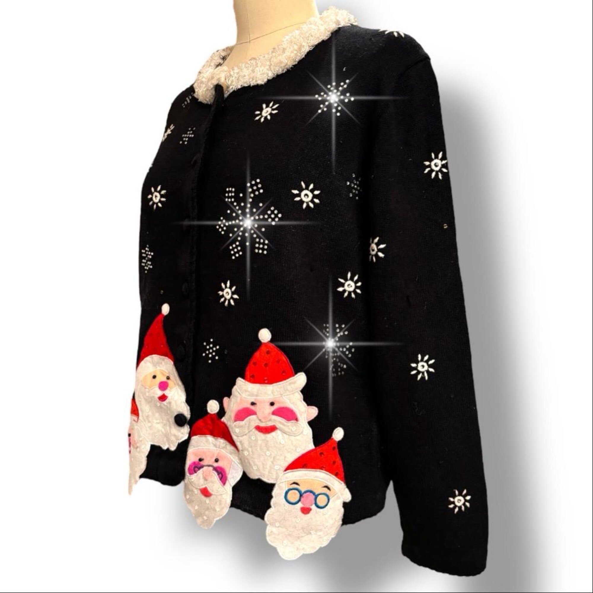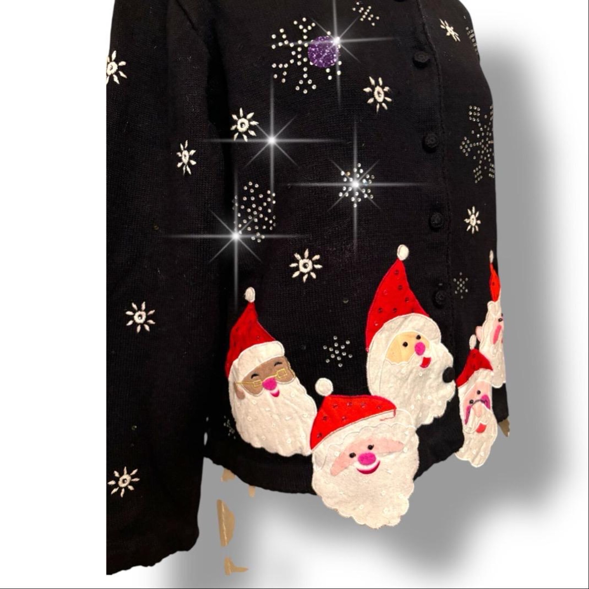 Vtg Black Ugly Christmas Sweater Santa Heads Heavy Rhinestones Snowflakes Sz L
