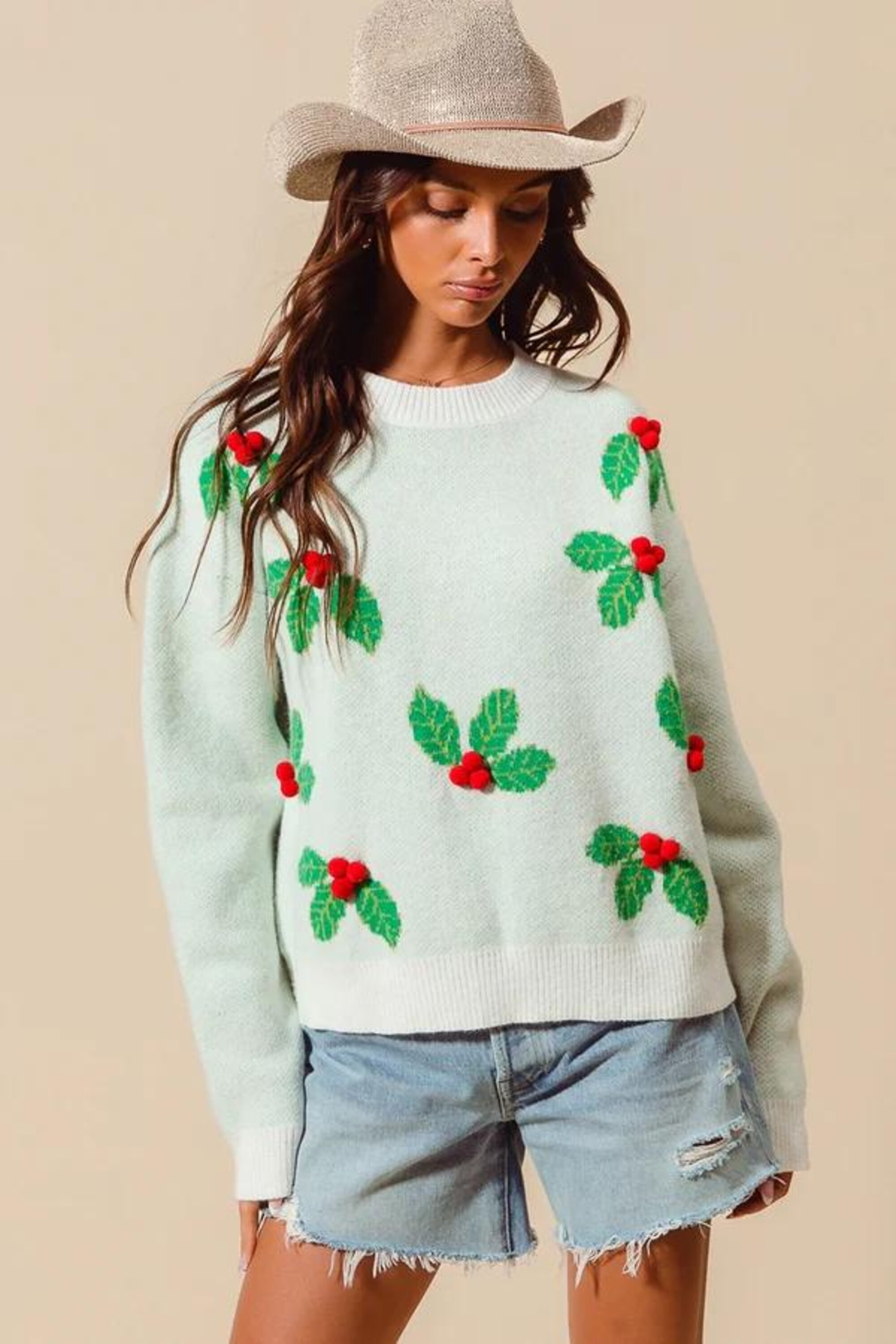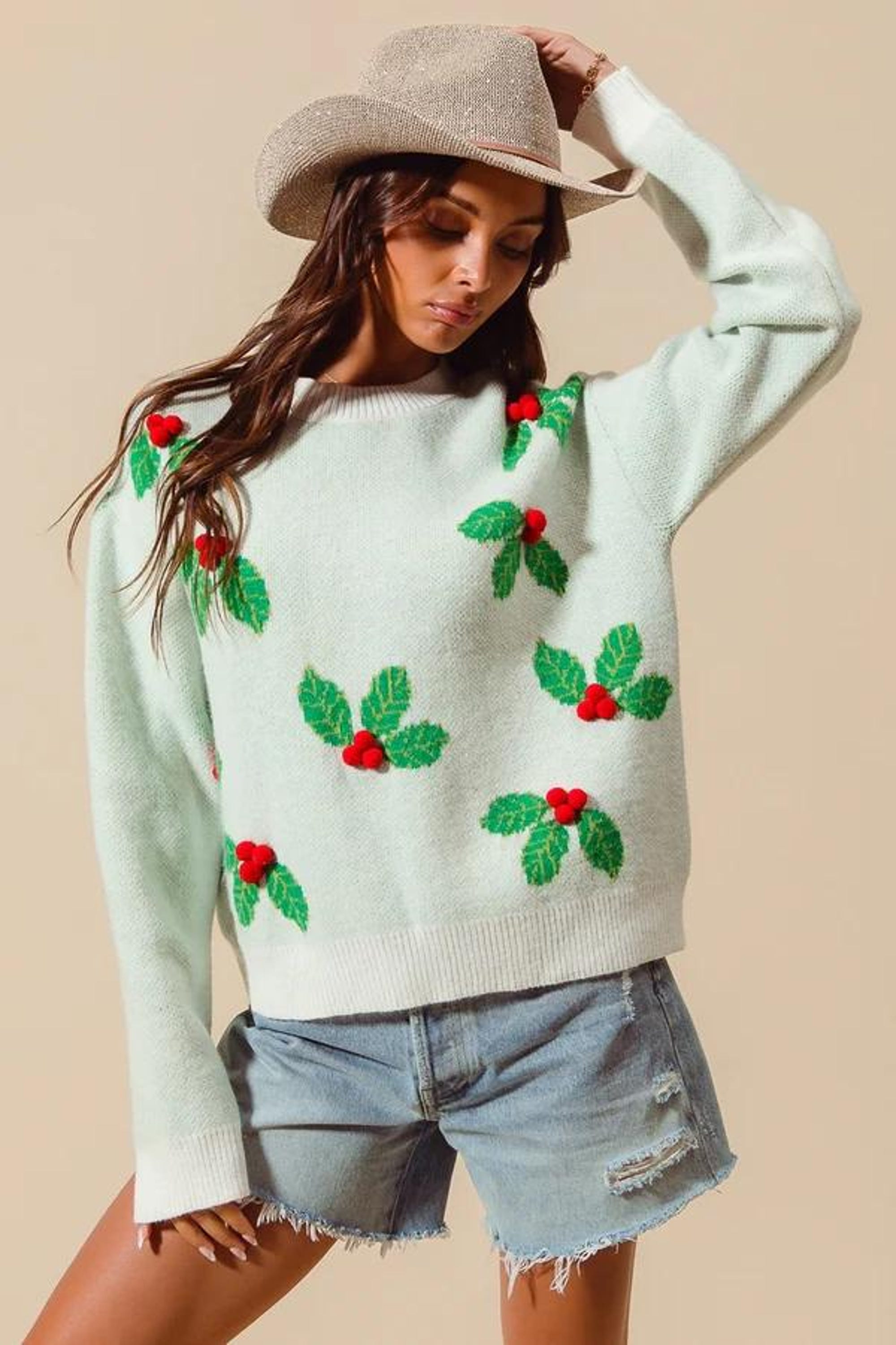 White Holly Berry Christmas Sweater: Pom Pom Embellished Holiday Top