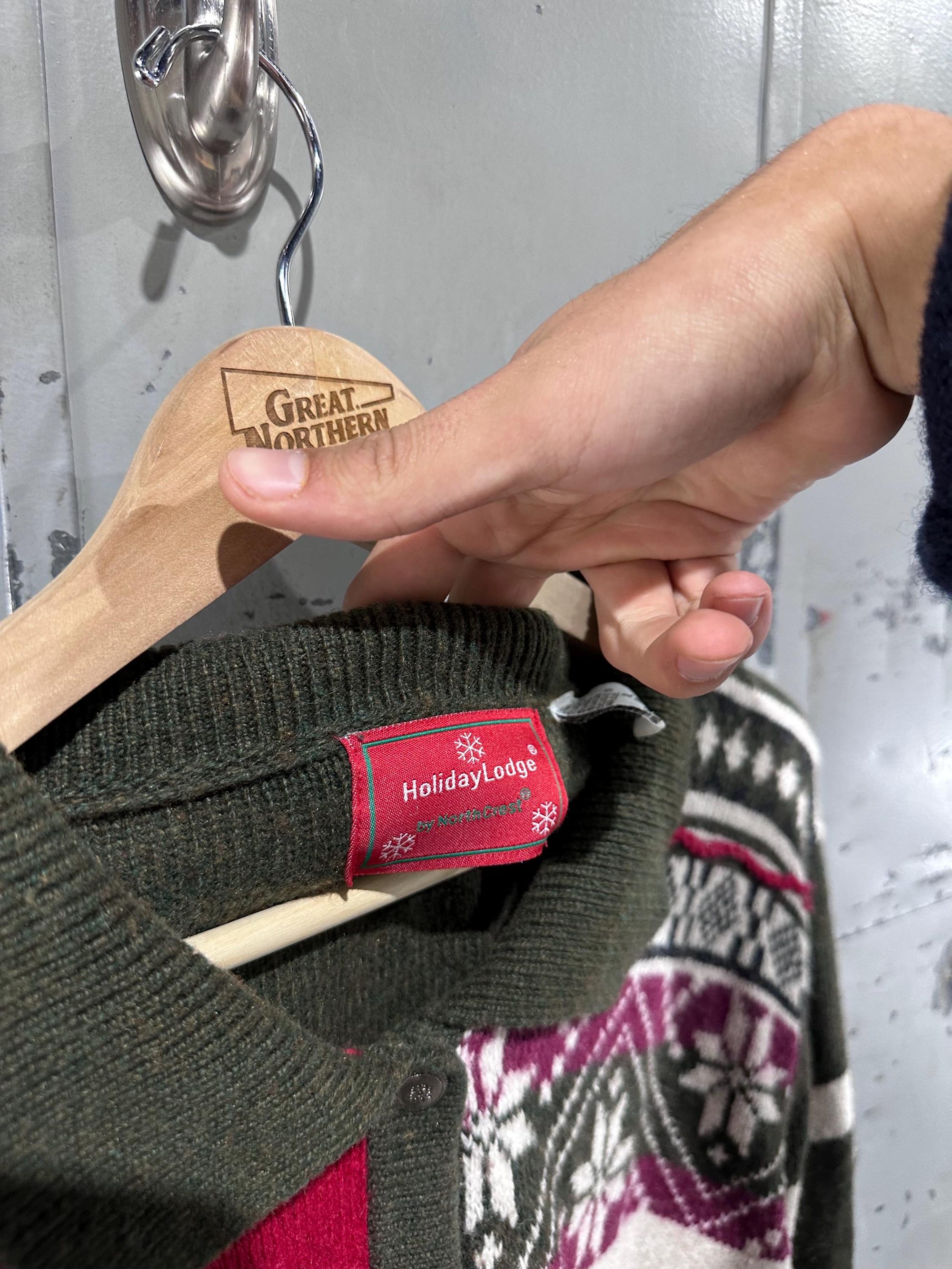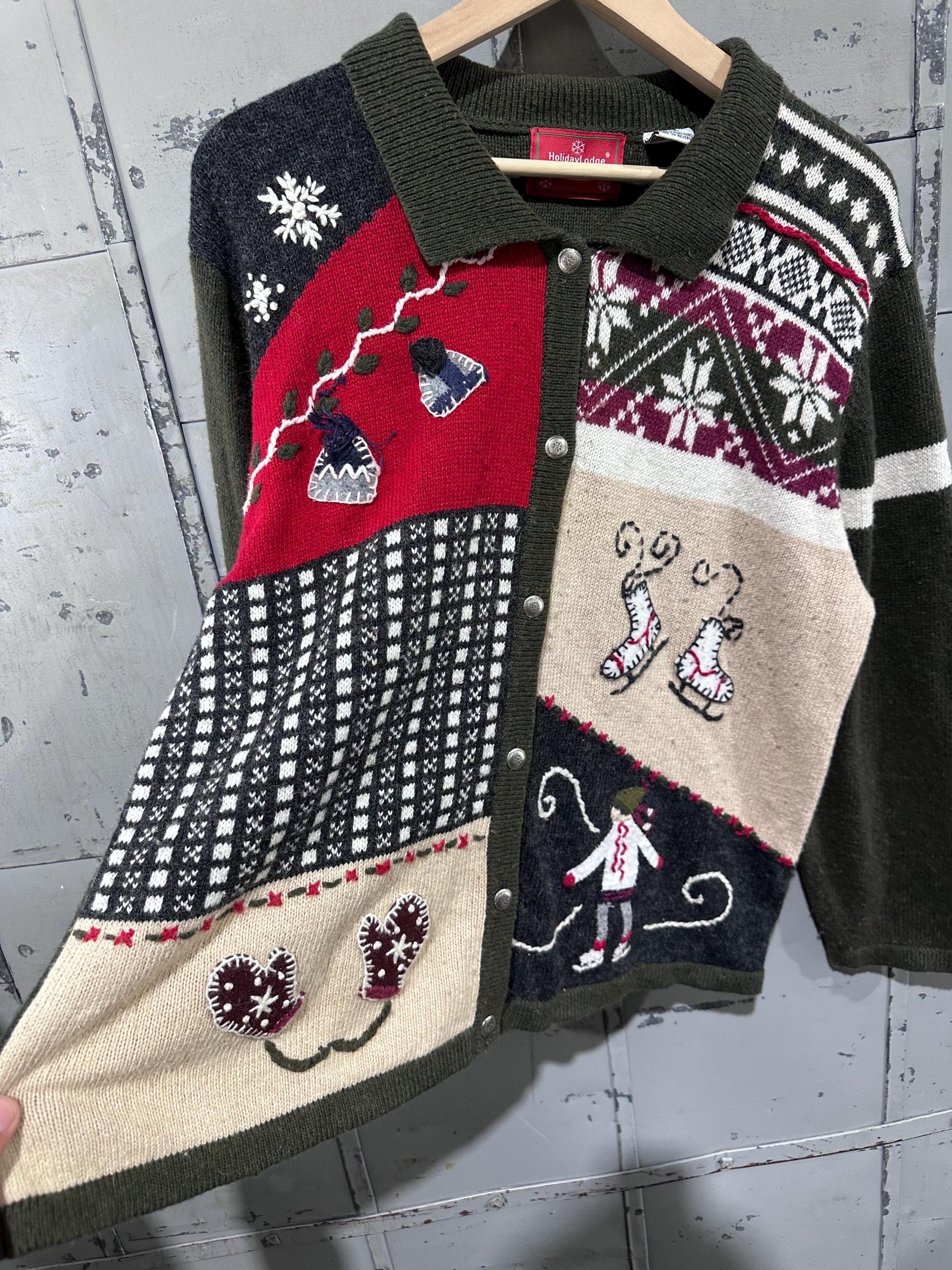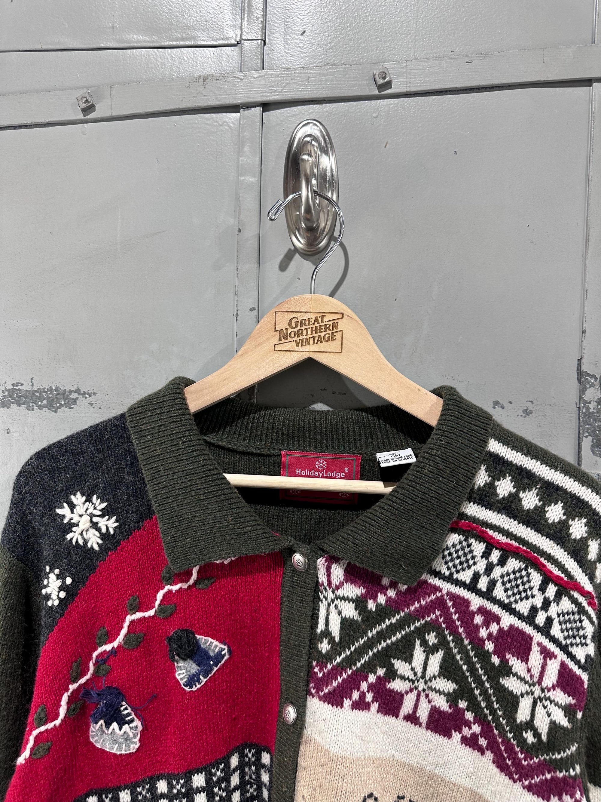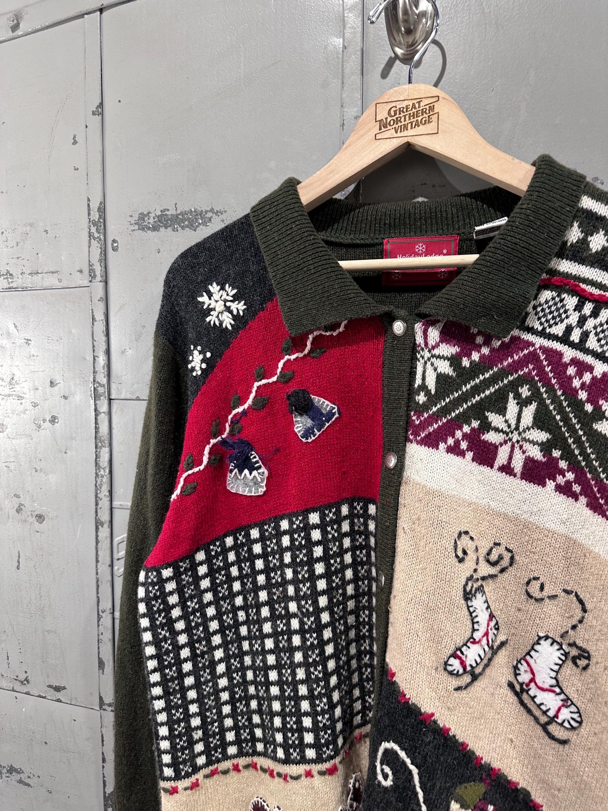 Y2K 2000s Holiday Lodge Christmas Patchwork Design Embroidered Picture Knit Button Up Cardigan Sweater XL